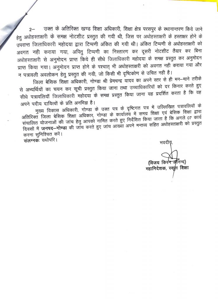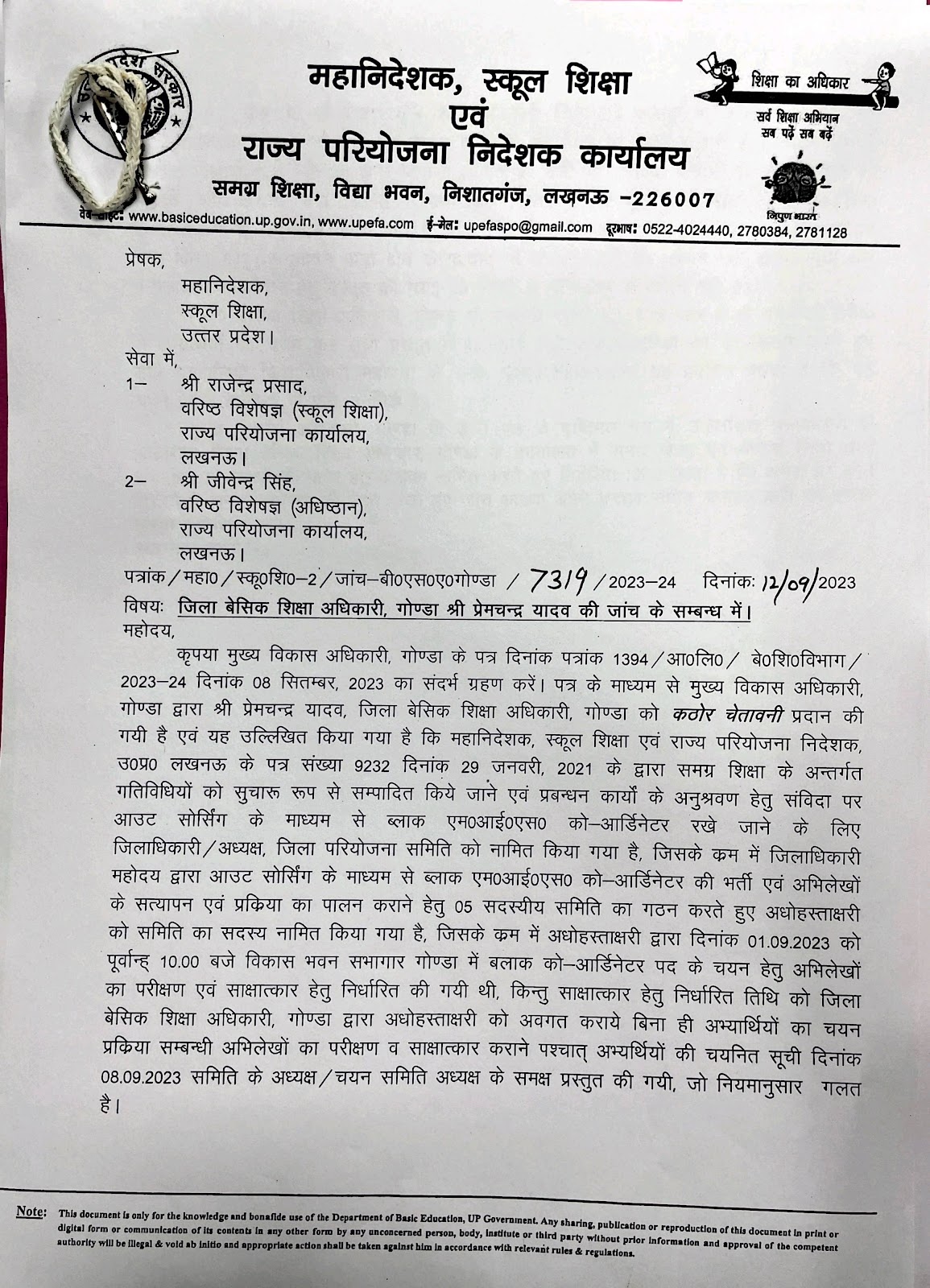 यूपी।गोंडा जिले के बीएसए प्रेमचन्द्र यादव के खिलाफ महानिदेशक स्कूल शिक्षा एवं राज्य परियोजना निदेशक ने शासन स्तर से दो सदस्यीय जांच कमेटी गठित कर जांच करने के निर्देश दिए हैं। 7 दिन के अंदर दो सदस्यीय टीम को गोंडा जिला बेसिक शिक्षा अधिकारी कार्यालय पहुंचकर संबंधित पत्रावलियों की जांच करके रिपोर्ट देने के निर्देश दिया गया है।