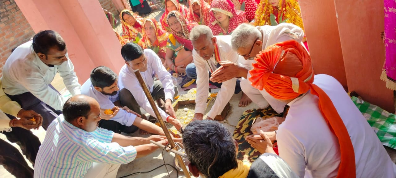 हरिद्वार के शांतिकुंज से आए ब्राह्मण महारूद्र एवं छत्रपाल सिंह के द्वारा सर्व प्रथम क्षेत्र एवं ग्राम में सुख शांति की कामना करके महिलाओं द्वारा कलश यात्रा निकाली गई । मंदिर में पूरे विधि विधान के साथ एवं प्राण प्रतिष्ठा कर मूर्तियाँ स्थापित की गई ।
