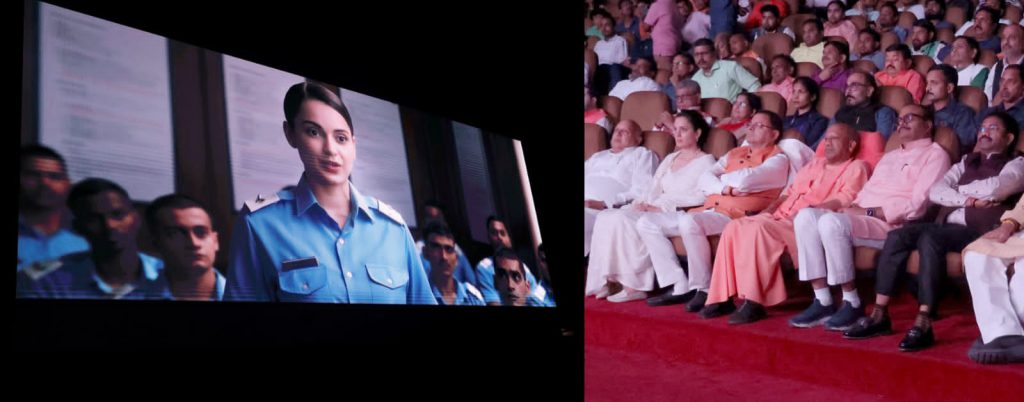 उत्तर प्रदेश के मुख्यमंत्री योगी आदित्यनाथ ने आज यहां लोक भवन आॅडिटोरियम में आयोजित स्पेशल स्क्रीनिंग में मंत्रिमण्डल के सदस्यों के साथ ‘तेजस’ फिल्म देखी।