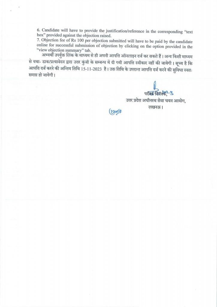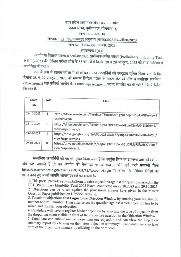 लखनऊ। उत्तर प्रदेश अधीनस्थ सेवा चयन आयोग की ओर से आयोजित प्रारंभिक अहर्ता परीक्षा (पीईटी) 2023 की प्रोविजनल आंसर सोमवार की जारी कर दी गई है। अभ्यर्थी इस पर 15 नवंबर तक अपनी आपत्ति दर्ज करा सकेंगे।