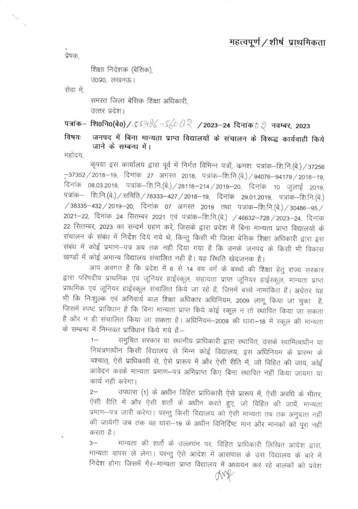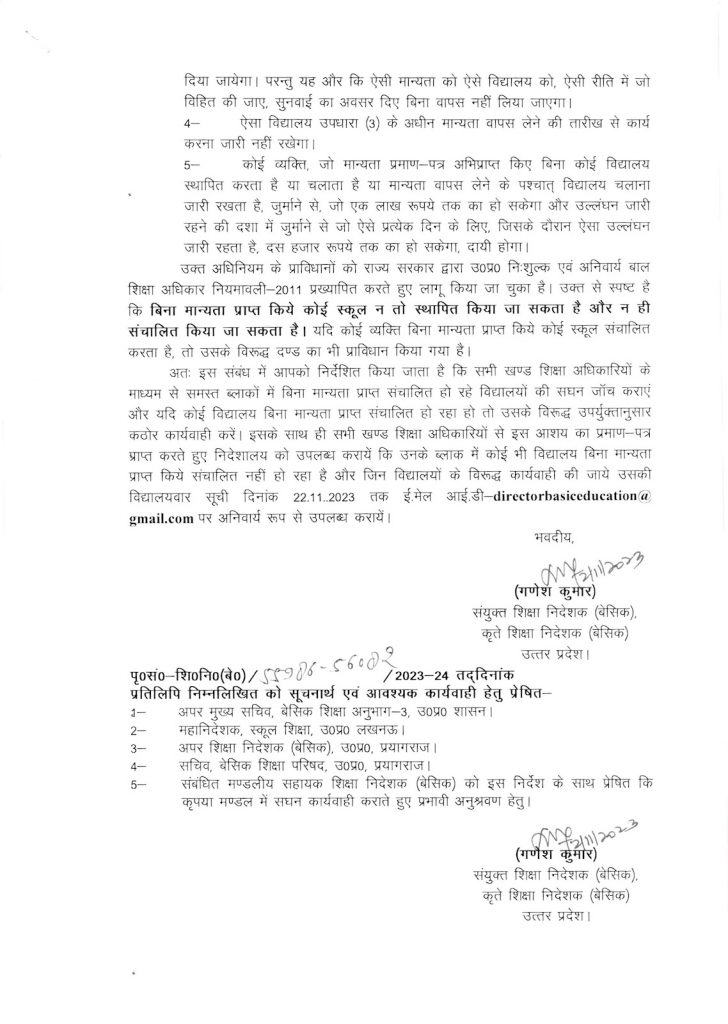 22 नवंबर तक सभी जिलों से अभियान की रिपोर्ट भी निदेशालय को उपलब्ध कराएंगे। संयुक्त शिक्षा निदेशक (बेसिक) गणेश कुमार ने निर्देश दिया है कि सभी बीईओ ब्लॉकों में सघन अभियान चलाएं। यदि कोई विद्यालय बिना मान्यता के चल रहा है तो उनके खिलाफ कड़ी कार्रवाई करें। अभियान में जिन विद्यालयों के खिलाफ कार्रवाई की गई है, उसकी विद्यालयवार सूची भी उपलब्ध कराएं।