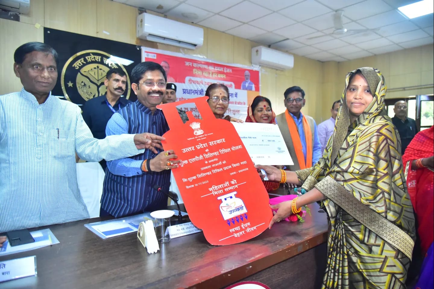 उत्तर प्रदेश सरकार के औद्योगिक विकास मंत्री नन्द गोपाल गुप्ता नन्दी शुक्रवार को कलेक्ट्रेट स्थित संगम सभागार में प्रधानमंत्री उज्जवला योजना के लाभार्थिंयों को निःशुल्क गैस सिलेण्डर रिफिल वितरण कार्यक्रम में मुख्य अतिथि के रूप में सम्मिलित हुए। इस दौरान प्रधानमंत्री उज्जवला योजना के लाभार्थिंयों की उपस्थिति में मुख्यमंत्री द्वारा लखनऊ में आयोजित निःशुल्क गैस सिलेण्डर रिफिल वितरण कार्यक्रम कार्यक्रम का सजीव प्रसारण किया गया। मंत्री नन्दी ने उज्जवला योजना के करीब 20 लाभार्थिंयों को गैस सिलेण्डर रिफिलिंग से सम्बंधित सांकेतिक चेक प्रदान किया। प्रयागराज के 6,76,050 लाभार्थियों को इस योजना का लाभ मिलेगा।