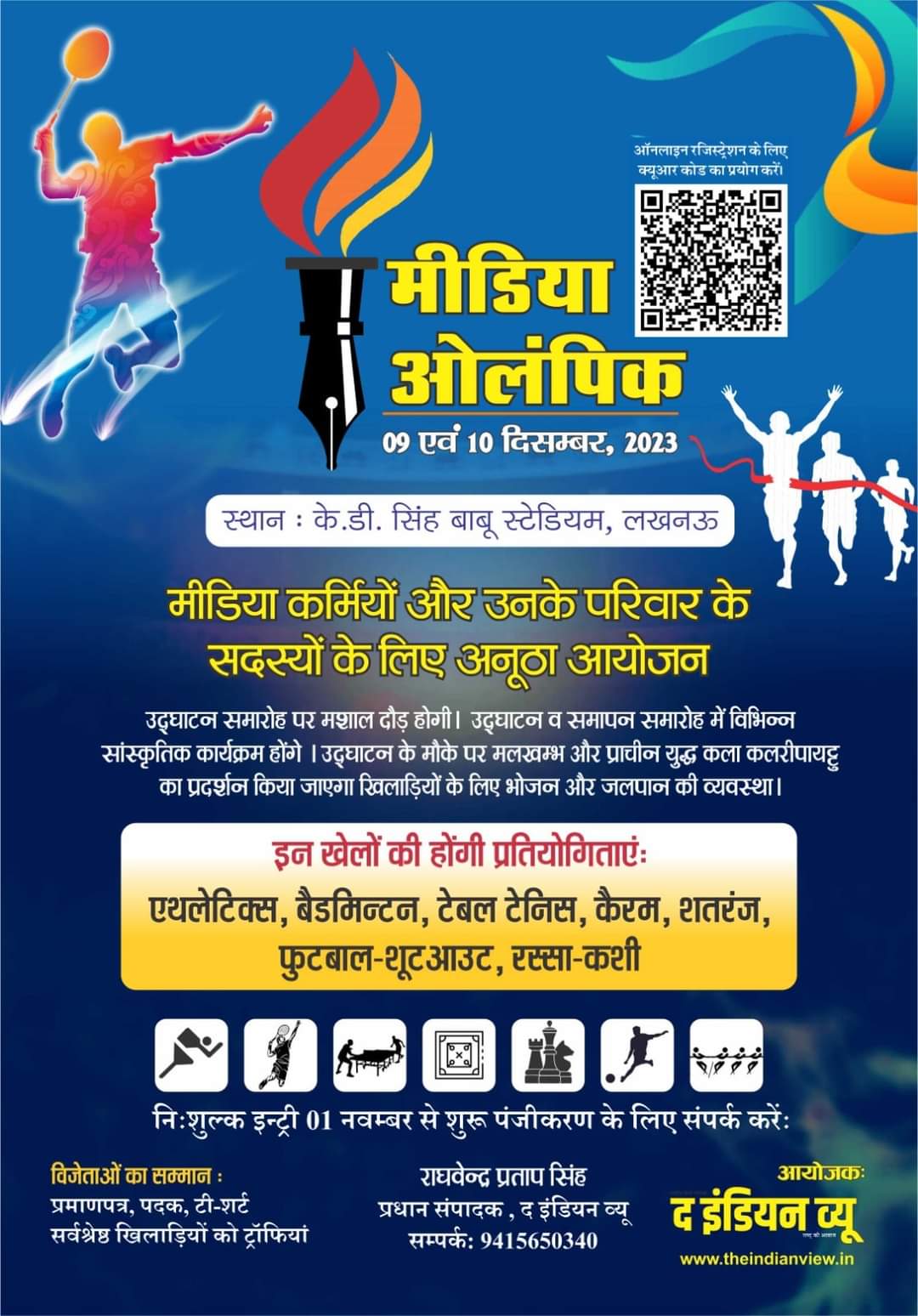 लखनऊ : उत्तर प्रदेश के मीडियाकर्मियों और उनके परिजनों के स्वास्थ्य व फिटनेस को ध्यान में रखते हुए मीडिया ओलंपिक के द्वितीय संस्करण का आयोजन द इंडियन व्यू मासिक समाचार पत्रिका के तत्वावधान में 9 और 10 दिसंबर 2023 को केडी सिंह बाबू स्टेडियम लखनऊ में किया जा रहा है जिसमे प्रदेश भर से लोगों का आगमन होगा ।