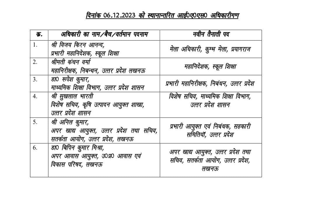 इसके अलावा विशेष सचिव माध्यमिक शिक्षा डा. रूपेश कुमार को आईजी निबंधन उत्तर प्रदेश, सुखलाल भारती विशेष सचिव कृषि उत्पादन आयुक्त शाखा को विशेष सचिव माध्यमिक शिक्षा बनाया गया है। अपर खाद्य आयुक्त उत्तर प्रदेश तथा सचिव सतर्कता आयोग अनिल कुमार अब प्रभारी आयुक्त एवं निबंधक सहकारी समितियां के पद पर तैनात किए गए हैं। वहीं अपर आवास आयुक्त आवास विकास परिषद उप्र डा. विपिन कुमार मिश्रा को अपर खाद्य आयुक्त उत्तर प्रदेश के साथ ही सचिव सतर्कता आयोग के पद पर तैनात किया गया है।