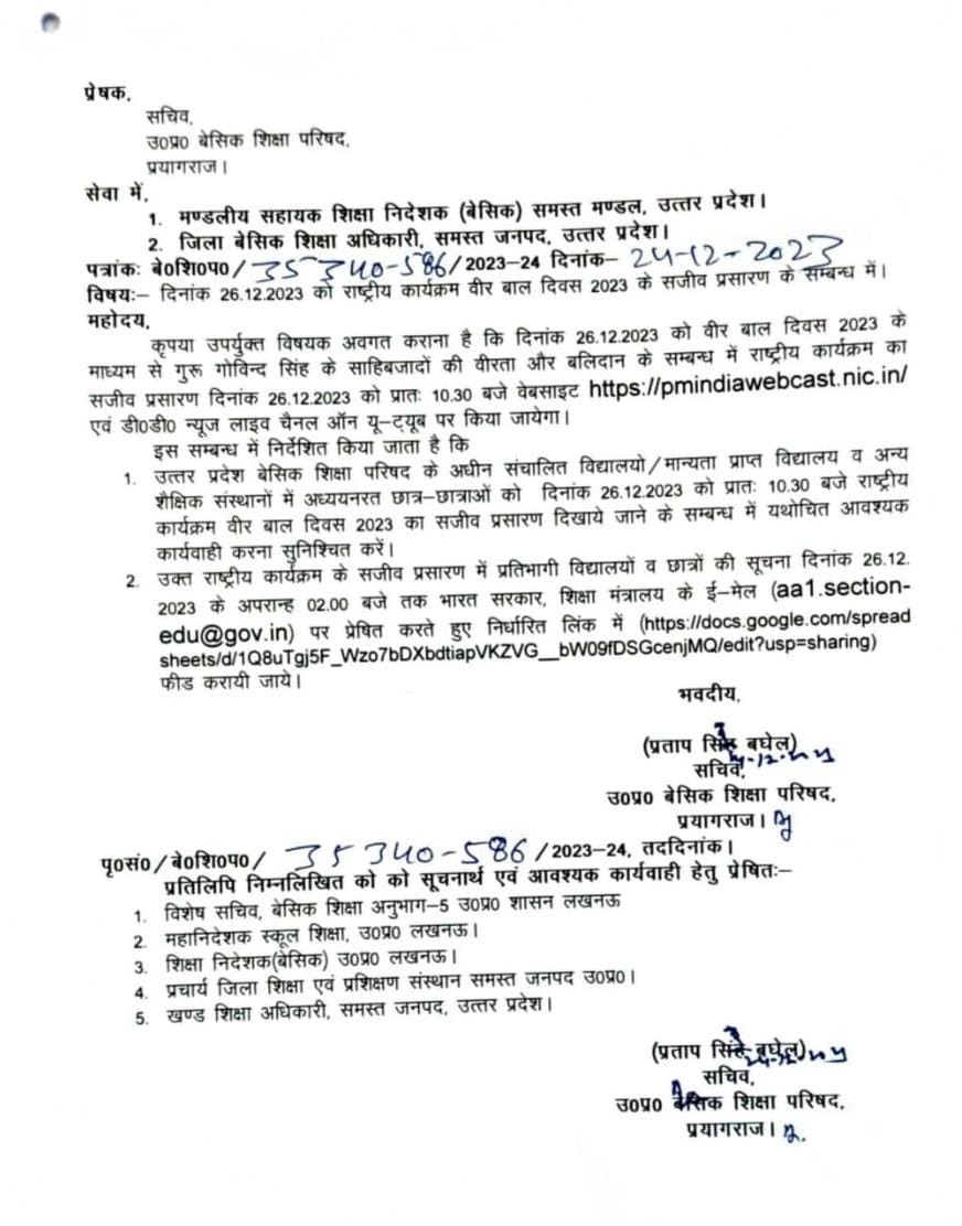 बेसिक शिक्षा परिषद के सभी विद्यालयों में 26 दिसंबर को सुबह 10.30 बजे वीर बाल दिवस मनाया जाएगा। इसमें गुरु गोविंद सिंह के साहिबजादों की वीरता और बलिदान के संबंध में राष्ट्रीय कार्यक्रम का सजीव प्रसारण किया जाएगा। परिषद के सचिव प्रताप सिंह बघेल ने इस संबंध में सभी जिला बेसिक शिक्षा अधिकारियों एवं मंडलीय सहायक शिक्षा निदेशकों को निर्देश जारी किया है।