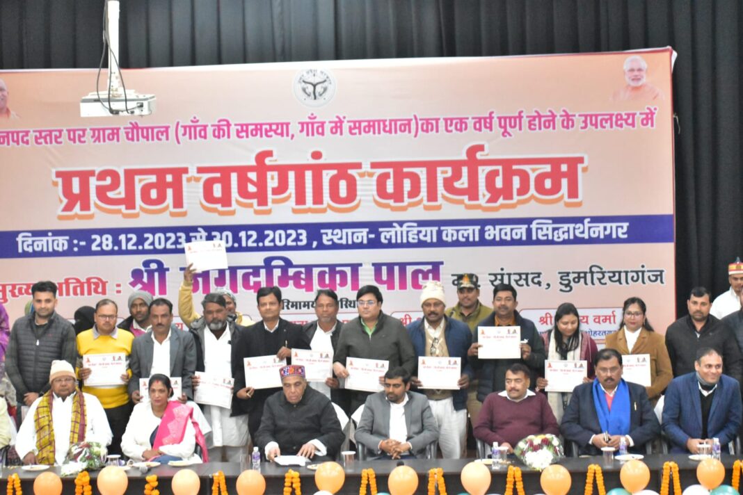 सिद्धार्थनगर उत्तर प्रदेश सरकार द्वारा चलाये जा रहे ग्राम चौपाल ग्रांव की समस्या गांव में समाधान कार्यक्रम का 01 वर्ष पूर्ण होने के उपलक्ष्य में आयोजित कार्यक्रम का सांसद डुमरियागंज जगदम्बिका पाल की अध्यक्षता एवं मुख्य विकास अधिकारी जयेन्द्र कुमार की उपस्थिति में लोहिया कलाभवन में द्वीप प्रज्ज्वलित कर शुभारम्भ किया गया।