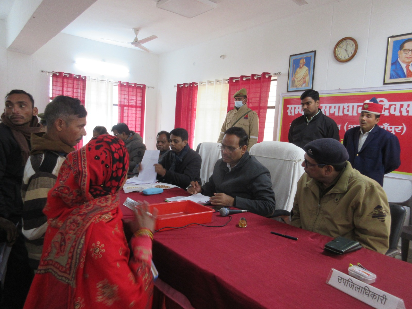शाहजहाँपुर/दिनांक 20.01.2024/ जिलाधिकारी श्री उमेश प्रताप सिंह की अध्यक्षता में तहसील कलान में संपूर्ण समाधान दिवस संपन्न हुआ। जिलाधिकारी ने शिकायतकर्ताओं की शिकायतों व समस्याओं को सुना तथा उनका गुणवत्तापूर्ण एवं प्रभावी निस्तारण निर्धारित समयावधि में सुनिश्चित करने के निर्देश संबंधित अधिकारियों को दिए। तहसील कलान में आयोजित सम्पूर्ण समाधान दिवस में कुल 39 शिकायतें प्राप्त हुयी, जिसमें से 06 प्रकरणों का निस्तारण मौके पर ही कर दिया गया। जिलाधिकारी ने शेष प्रकरणों को ससमय निस्तारण करने के निर्देश सम्बन्धित अधिकारियों को दिये। सम्पूर्ण समाधान दिवस के दौरान राजस्व 9, विकास 5, समाज कल्याण 6, विधुत 2, पुलिस 5, कृषि 3, खाद्य एवं रसद 3, निस्तारित 6 प्रकरण प्राप्त हुए।