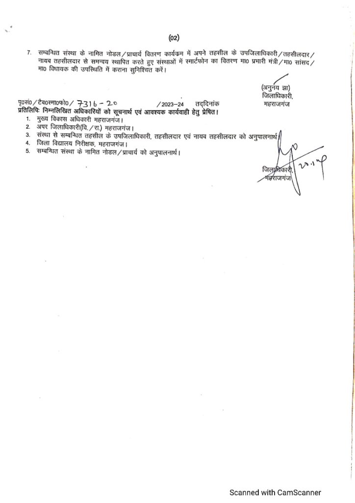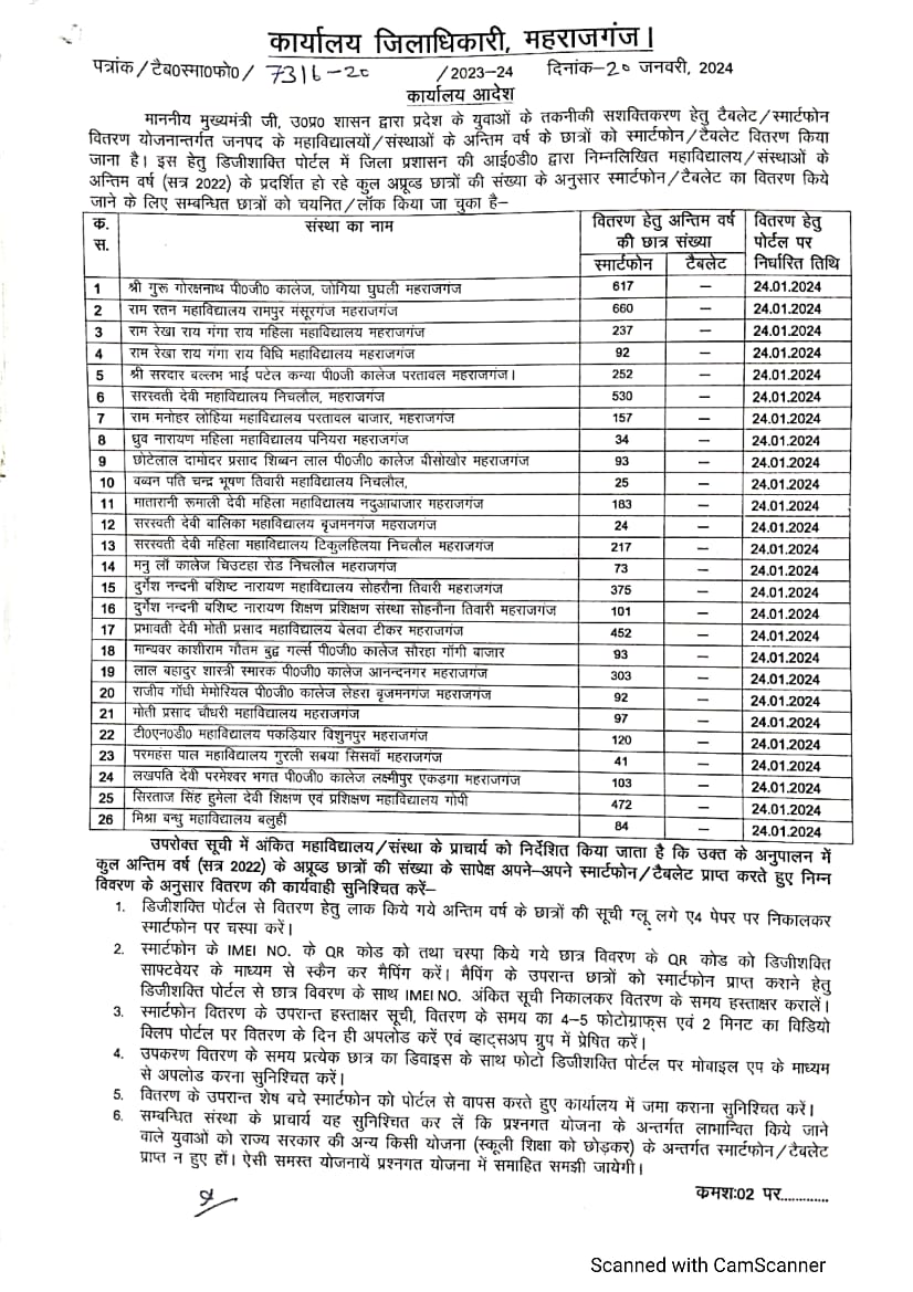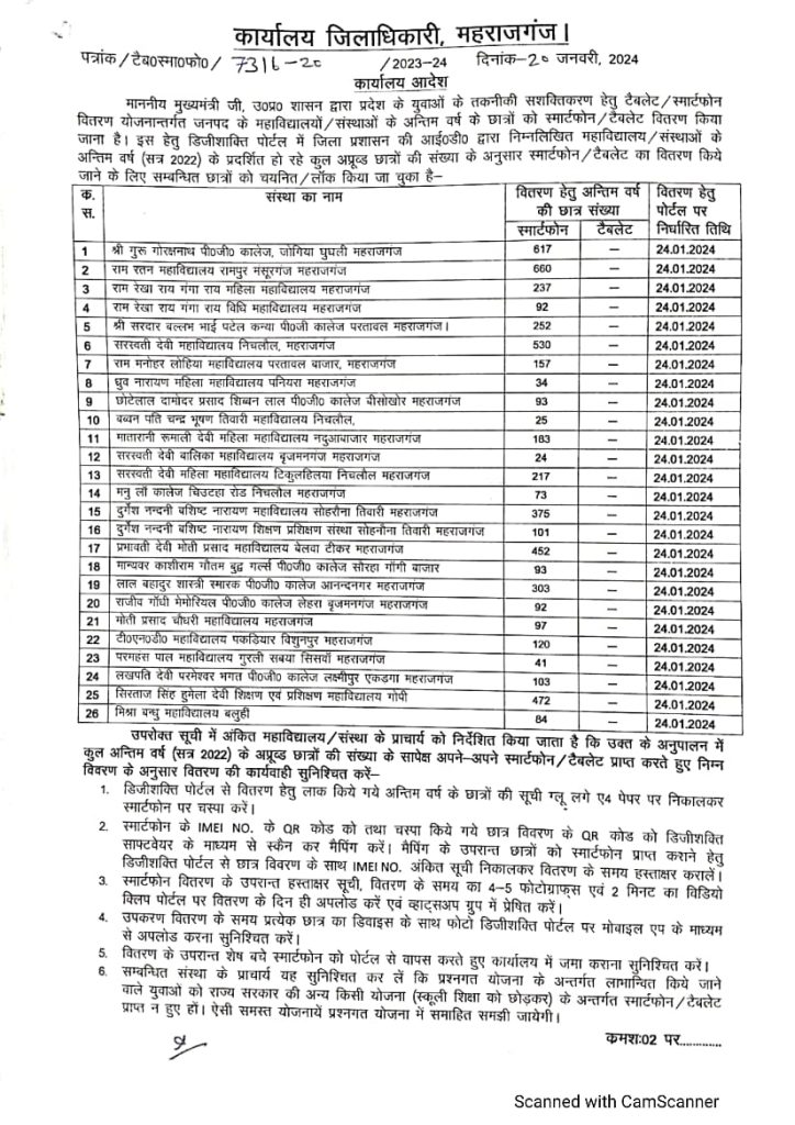 महराजगंज जनपद के दूसरी बार में कुल 26 कालेजों/महाविद्यालयों में स्वामी विवेकानंद युवा सशक्तिकरण योजनांतर्गत स्नातक अंतिम वर्ष 2022-23 के छात्र छात्राओं को टैबलेट/स्मार्टफोन का वितरण किया जाएगा।उत्तर प्रदेश की योगी सरकार युवाओं को डिजिटल रूप से सशक्तिकरण करने हेतु उच्च शिक्षण संस्थानों में अध्ययन कर पास हो चुके स्नातक/परास्नातक छात्र छात्राओं को प्रतिवर्ष डिजिशक्ति पोर्टल के माध्यम से टैबलेट/स्मार्टफोन वितरित कर रही है।ऐसे में वर्ष 2023-24 में सरकार द्वारा 25 लाख युवाओं को स्मार्टफोन/टेबलेट वितरण किया जाना है ,जो लक्ष्य अपने अंतिम रूप में गतिमान है।इसी क्रम में महराजगंज जनपद के उच्च शिक्षण संस्थानों में दूसरी बार वितरण के क्रम में 26 कालेजों का चयन किया गया।इन कालेजों के डिजिशक्ति पोर्टल पर कालेज द्वारा नामित नोडल अधिकारी के द्वारा स्नातक अंतिम वर्ष सत्र 2022-23 के नियमित छात्र छात्राओं का अंतिम रूप से चयन किया था।जिसको विभाग द्वारा वेरीफाई कर सूची उपलब्ध करा दी गयी। इस क्रम में जनपद के 26 कॉलेज इस प्रकार हैं-