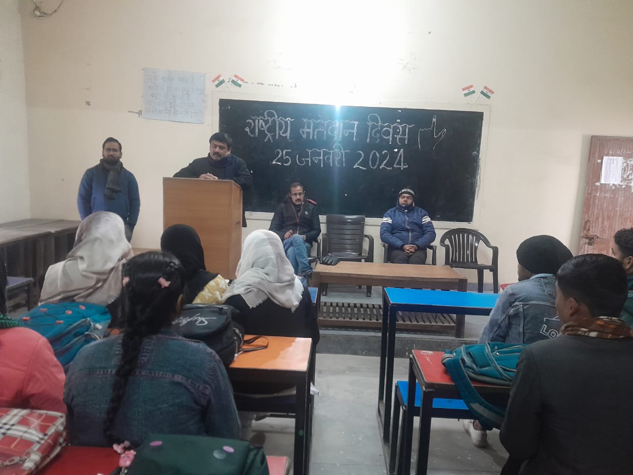 सहसवान/बदायूं : आज दिनांक 25 जनवरी 2024, दिन- गुरुवार को आयोजित एक कार्यक्रम में राष्ट्रीय मतदाता दिवस के रूप में मनाया गया। प्राचार्य डॉ. अजय कुमार सिंधु द्वारा उपरोक्त के सन्दर्भ मे विद्यार्थियों को उनके मत का सही प्रयोग तथा बिना भेद भाव तथा बिना लालच के देश के प्रगति में में अपने मत का सही प्रयोग करने तथा अपने मत के अधिकार का प्रयोग कर सही उम्मीदवार को चुने जो देश और समाज को आगे बढ़ाने में सहायता करें,साथ ही भूगोल प्रवक्ता डॉ मुकेश राघव ने सभी को वोट डालने के लिए प्रेरित किया और डॉ एम.पी. सिंह ने छात्रों को देश हित में अधिक से अधिक मतदान करने के लिए प्रेरित किया ।