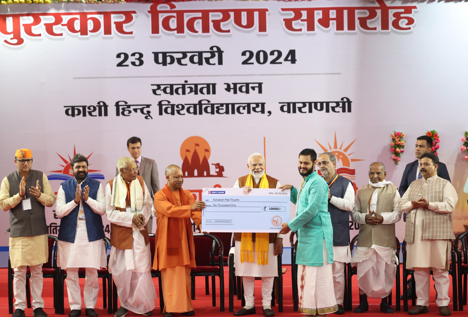 इससे पूर्व उत्तर प्रदेश के मुख्यमंत्री योगी आदित्यनाथ ने प्रधानमंत्री का स्वागत करते हुए उन्हें दुनिया के सबसे लोकप्रिय राजनेता बताया। उन्होंने कहा कि प्रधानमंत्री का दुनिया के प्राचीनतम नगरी काशी में उस समय आगमन हुआ है, जब 500 वर्षों के प्रभु श्रीरामलला के वनवास के कालखंड को समाप्त कर अयोध्या धाम में अपनी दूरदर्शिता, वचनबद्धता और कर कमलों से प्रभु को विराजमान हुए हैं। उन्होने कहा कि अयोध्या धाम के साथ ही प्रधानमंत्री नरेंद्र मोदी की प्रेरणा व प्रयास से संयुक्त अरब अमीरात में पहला हिंदू मंदिर बना है। गत सप्ताह ही उसका लोकार्पण कर वे काशी पधारे हैं। काशी मंदिरों का ही शहर है। अब काशी की आभा वैश्विक मंच पर सांस्कृतिक रूप से बुलंद हो रही है। अबूधाबी में बना मंदिर भी इसका नया उदाहरण है। प्रधानमंत्री द्वारा गुरुवार को आगमन के दौरान बाबतपुर एयरपोर्ट से बीएलडब्ल्यू जाते समय नवनिर्मित फुलवरिया फोरलेन के निरीक्षण की चर्चा करते हुए मुख्यमंत्री ने कहा कि जब लोग सोते है, तो प्रधानमंत्री जगकर लोगो की सुविधाओं का ध्यान रखते हैं। पिछले 10 वर्ष में आध्यात्मिक व सांस्कृतिक पहचान को बनाए रखते हुए काशी नए कलेवर के रूप में दुनिया के सामने आई है।उन्होने कहा कि अमूमन जनप्रतिनिधि का मतलब विकास के लिए प्रयास करना होता है, लेकिन प्रधानमंत्री का नियमित रूप से सांसद के रूप में काशी से जुड़ाव है। वे काशीवासियों के हितों के लिए कार्य करते हुए यहां की पुरातन आध्यात्मिक व सांस्कृतिक विरासत को वैश्विक मंच पर प्रतिष्ठा प्रदान कर रहे हैं। ऐसी प्रतियोगिताओं के माध्यम से समाज के अलग- अलग तबके के लोगों को जोड़कर कार्यक्रमों को नया स्वरूप प्रदान कर रहे हैं।