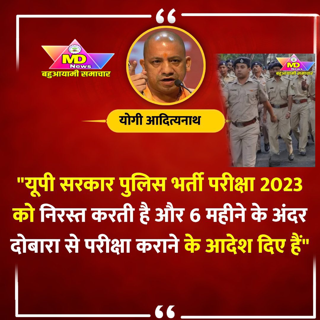 यूपी।यूपी पुलिस नागरिक भर्ती परीक्षा 2023 को सीएम योगी ने किया निरस्त।कहा 6 महीने के अंदर सूचित एवं शांतिपूर्ण तरीके से कराई जाएगी परीक्षा।ये जानकारी सीएम योगी ने एक्स पर दी।वही सूचित भंग करने वालों को न बक्सने कि बात कही।इस खबर से अभ्यर्थियों में नई उम्मीद जगी है।वही सीएम योगी के इस फैसलों को लोगों ने युवाओं के हित में निर्णायक कदम बताया।