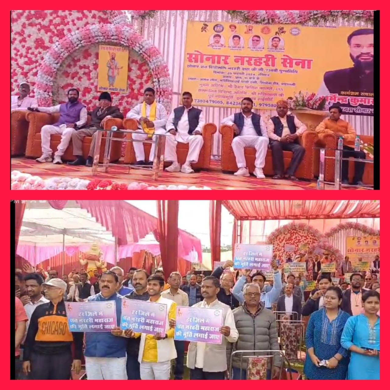 वाराणसी:- सोनार नरहरी सेना के द्वारा वाराणसी मे सिन्धोरा रोड स्थित अमन लान मे बड़े ही हर्षोल्लास के साथ मनाया गया सोनार संत शिरोमणि नरहरी दास की 738वीं पुण्यतिथि | सोनार नरहरी सेना के राष्ट्रीय संस्थापक राहुल सिंह स्वर्णकार ने बताया कि विगत वर्ष की भांति इस वर्ष भी सोनार संत नरहरी दास की पुण्यतिथि विभिन्न जिलों विभिन्न प्रांतो से समाज के लोगों के बीच मनाने का कार्य किया गया एवं सोनार संत नरहरी दास के चरणों में श्रद्धा सुमन अर्पित कर कार्यक्रम की शुरुआत कीं |
