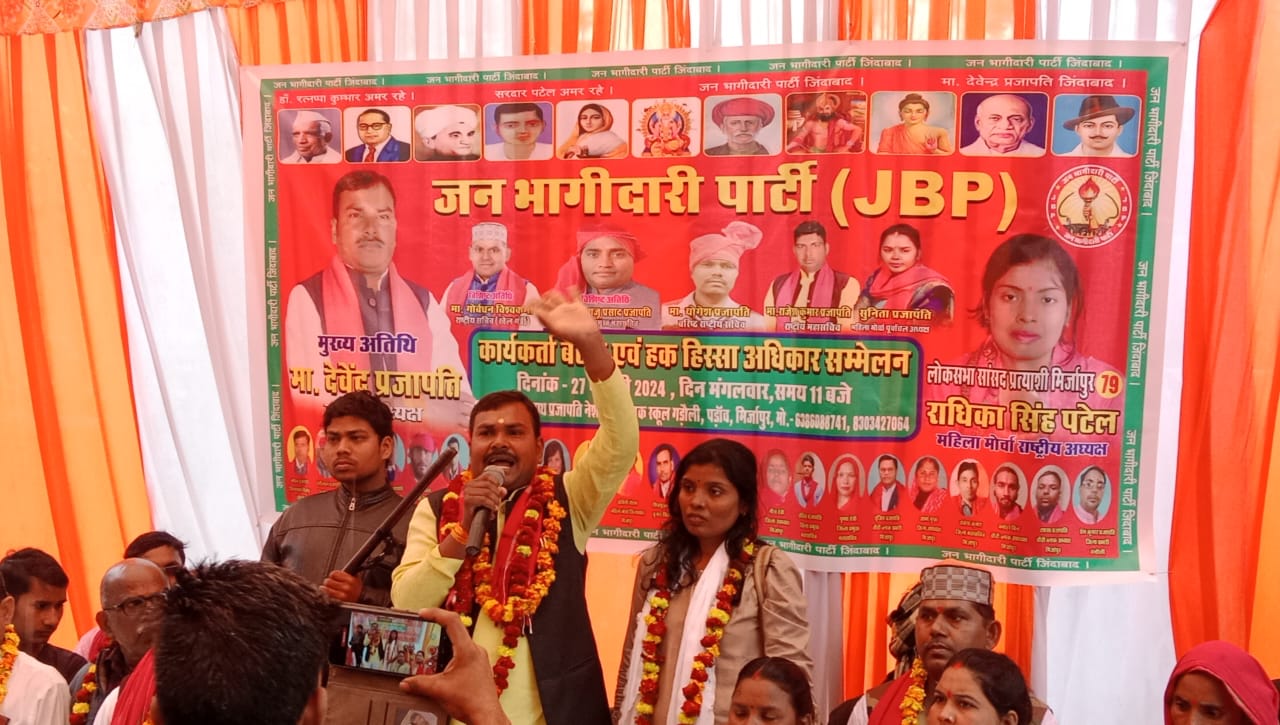 (रोहित सेठ )जन भागीदारी पार्टी के तत्वधान, में कार्यकर्ता बैठक एवम हक हिस्सा अधिकार सम्मेलन आयोजित किया गया। जनपद मिर्जापुर राष्ट्रीय अध्यक्ष देवेन्द्र कुमार प्रजापति का जोर दार स्वागत किया गया । जिन्होंने भाजपा की सरकार पर निशाना साधा और कहा कि यह सरकार गरीबों का हक अधिकार मार कर बैठी है युवाओं के रोजगार के बजाय लोगो का खून चूस रही है, और बेरोजगारी मंहगाई भ्रष्ठा चार चरम पर है। जिसमे समस्त कार्यकर्त्ता उपस्थित रहे। साथ में राष्ट्रीय सचिव खेल मंत्री गोवर्धन सिंह विश्वकर्मा, राष्ट्रीय प्रमुख महासचिव एडवोकेट राजू प्रजापति महिला मोर्चा राष्ट्रीय एवम लोकसभा सांसद प्रत्यासी मिर्जापुर राधिका सिंह पटेल वरिष्ठ राष्ट्रीय सचिव योगेश प्रजापति,, राष्ट्रीय महासचिव राजेश कुमार प्रजापति, पूर्वांचल प्रदेश अध्यक्ष महिला मोर्चा सुनीता प्रजापति मण्डल अध्यक्ष राजकुमारी , महिला मोर्चा यामिनी गौतम युवा मण्डल प्रभारी मनीष प्रजापति,, जनपद चंदौली से मण्डल अध्यक्ष प्रेम कुमार प्रजापति, जनपद चंदौली जिला अध्यक्ष धर्मेंद्र प्रजापति,, प्रियंका वर्मा , मिर्जापुर जिला अध्यक्ष मोहन प्रजापति जिला प्रभारी मंटू प्रजापति, जिला प्रभारी संतोष प्रजापति, डॉक्टर शिव कुमार प्रजापति, जिला सलाहकार होरी लाल प्रजापति, तपन पटेल , जिला प्रभारी दीपक , विद्या रंजित प्रजापति अमरनाथ प्रजापति , उपस्थित रहे।