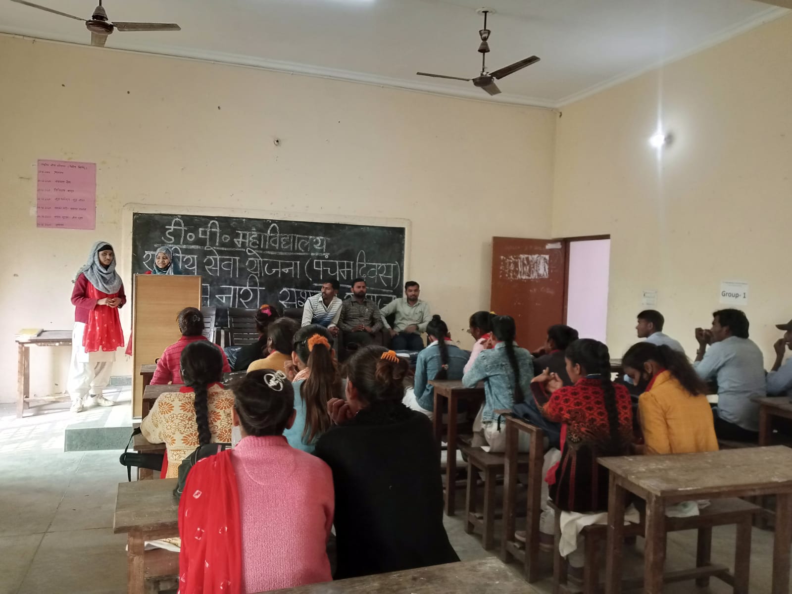 बदायूं/उत्तर प्रदेश : डी॰पी॰ महाविद्यालय सहसवान में राष्ट्रीय सेवा योजना के सात दिवसीय विशेष शिविर का पंचम दिवस था | आज का विषय “सशक्त नारी सशक्त समाज | आज प्रातः 10 बजे स्वयंसेवक/स्वयंसेविकाएँ महाविद्यालय में उपस्थित हुये | महाविद्यालय में एकत्रित होने के बाद विद्यार्थियों ने अध्यापकों के नेतृत्व में चयनित ग्राम पीतमनगर तक रैली निकाली व ग्रामीणों को सशक्त नारी सशक्त समाज के बारे में जागरूक किया | दोपहर को जलपान करने के बाद बौद्धिक सत्र का आयोजन किया गया | कार्यक्रम का शुभारम्भ प्राचार्य डॉ. अजय कुमार सिन्धु व रा.से.यो. कार्यक्रम अधिकारी डॉ. मुकेश कुमार सिंह ने किया | कार्यक्रम का संचालन गणित के प्रवक्ता श्री भूपेन्द्र गुप्ता ने किया | कार्यक्रम अधिकारी डॉ. मुकेश कुमार सिंह ने अपने संबोधन में कहा कि सशक्त नारी से ही सशक्त समाज का निर्माण सम्भव है नारी परिवार का मूल होती है तथा परिवार के संचलान में सहगामी होती है जब तक नारी सशक्त नही होगी परिवार सशक्त नही होगा जब तक परिवार सशक्त नही होगा तब तक समाज सशक्त नही होगा ।
