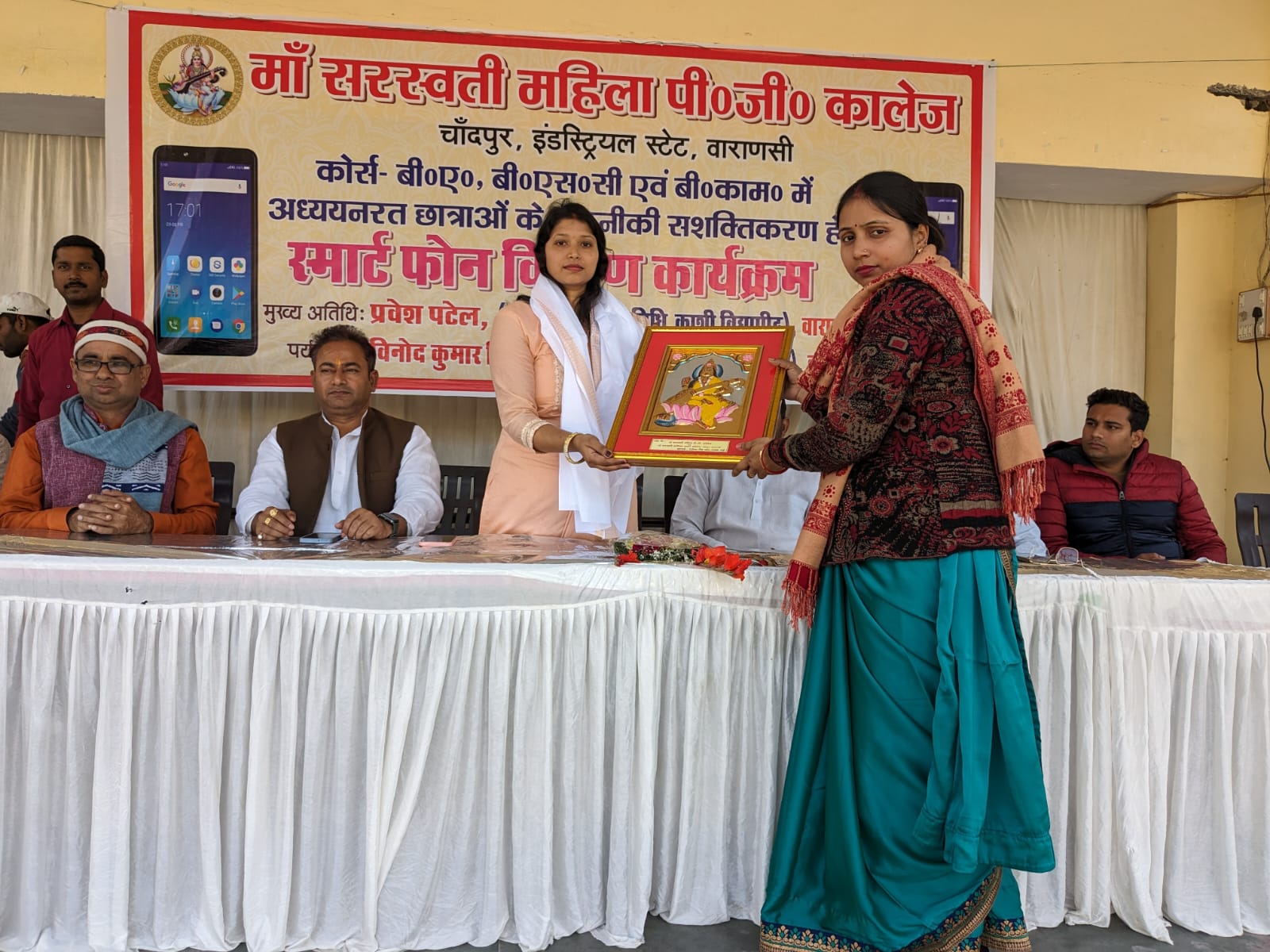 माॅं सरस्वती महिला पी०जी०कॉलेज,चांदपुर,इंडस्ट्रियल स्टेट, वाराणसी के प्रांगण में मा.मुख्यमंत्री जी के द्वारा स्वामी विवेकानंद सशक्तिकरण योजना के अंर्तगत निःशुल्क स्मार्टफोन वितरण कार्यक्रम का शुभारंभ किया गया जिसमे बी ए, बी०एससी०,और बीकॉम तृतीय वर्ष (सत्र 2022-23)के छात्र ,छात्राओं को स्मार्टफोन वितरण किया गया।