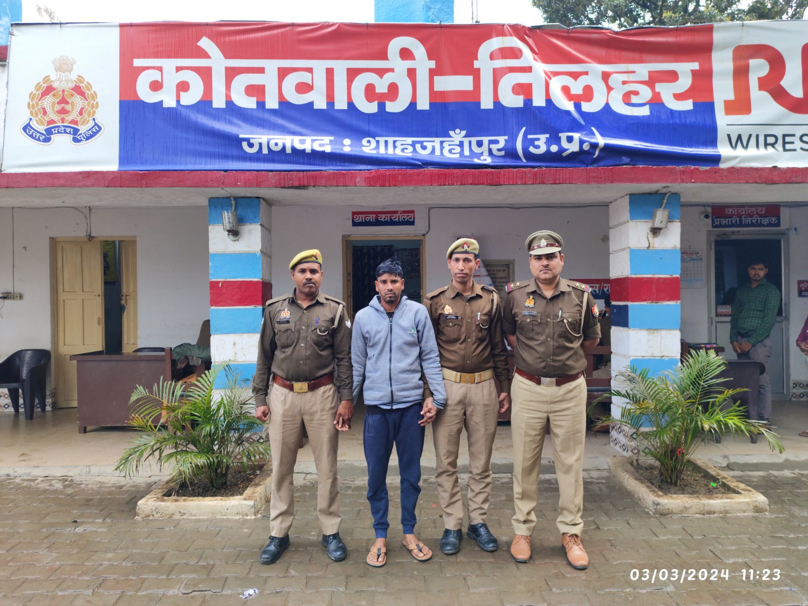शाहजहांपुर। अशोक कुमार मीणा, पुलिस अधीक्षक महोदय शाहजहाँपुर द्वारा चलाये जा रहे अभियान के दौरान श्री मनोज कुमार अवस्थी, अपर पुलिस अधीक्षक ग्रामीण के पर्यवेक्षण एवं श्री प्रयांक जैन क्षेत्राधिकारी तिलहर के निर्देशन तथा श्री सुरेन्द्रपाल सिंह प्रभारी निरीक्षक कोतवाली तिलहर के नेतृत्व में चलाये जा रहे अभियान रोकथाम जुर्म जरायम, अवैध शराब, चोरी , लूट , डकैती, गौ तस्कर , बरामदगी अवैध शस्त्र, मादक पदार्थ व वांछित अपराधी व वारन्टी की गिरफ्तारी के क्रम मे पुलिस टीम द्वारा मु0अ0सं0 907/2023 धारा 2/3 गैंगस्टर एक्ट के 25,000 रुपये ईनामी अभियुक्त छोटे पुत्र लाले नि0ग्रा0 भूडा थाना भोजीपुरा जनपद बरेली उम्र करीब 32 वर्ष को आज दिनांक 03.03.2024 को समय करीब 09.30 बजे पंण्डित ढाबे के पास स्थित पंचर की दुकान से 100 कदम बरेली की ओर रोड से गिरफ्तार किया गया ।