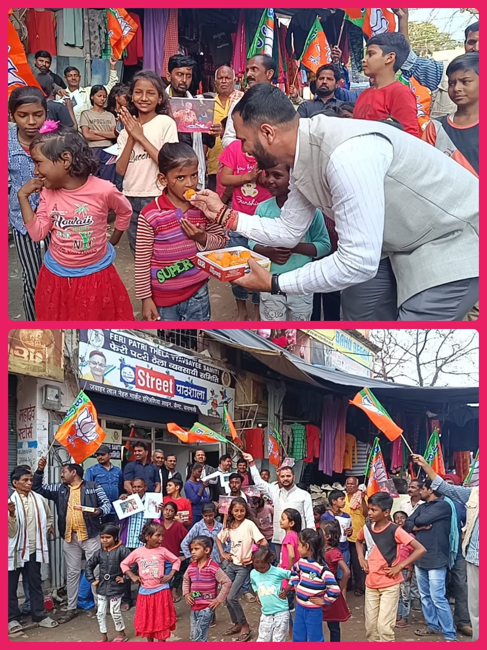वाराणसी:-फेरी पटरी ठेला व्यवसायी समिति उत्तर प्रदेश कार्यालय पर 3 मार्च रविवार को जवाहर लाल नेहरु मार्केट इंग्लिशिया लाइन में लोकसभा वाराणसी से नरेंद्र मोदी को पुनः प्रत्याशी घोषणा से उत्साहित फेरी पटरी ठेला व्यवसायी समिति के पदाधिकारियों व फेरी पटरी ठेला व्यवसायी समिति द्वारा प्रतिदिन नि:शुल्क संचालित होने वाली स्ट्रीट पाठशाला के बच्चों ने आतिशबाजी कर एक दूसरे को मिष्ठान खिलाकर खुशी का इजहार किया साथ स्ट्रीट पाठशाला के बच्चों द्वारा राम भजन पर नृत्य प्रस्तुति की गई |