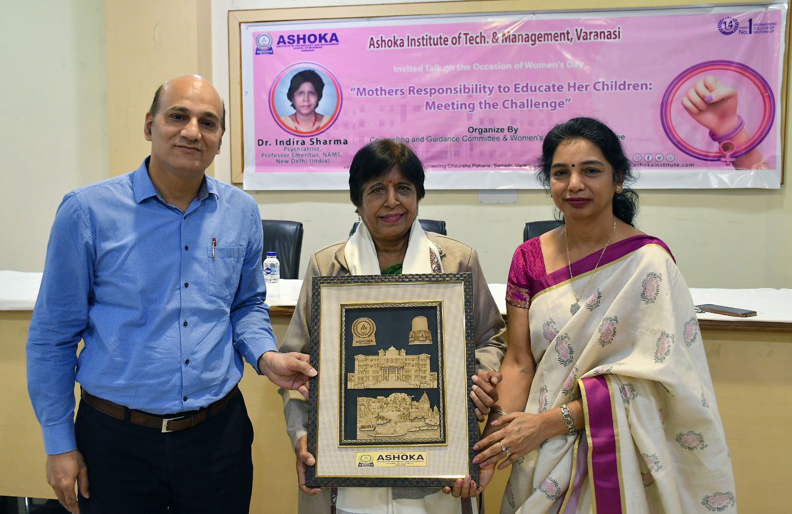 वाराणसी। पहडिया स्थित अशोका इंस्टीट्यूट ऑफ टेक्नोलॉजी एण्ड मैनेजमेंट में अंतरराष्ट्रीय महिला दिवस पर आयोजित गोष्ठी में मुख्य अतिथि साईकेट्रिस्ट प्रो0एमेरिटस एनएएमएस नई दिल्ली डा0 इंदिरा शर्मा ने कार्यक्रम का उद्घाटन दीप प्रज्जवल व मां सरस्वती के चित्र पर पुष्पांजलि अर्पित कर किया । मंचासीन अतिथि का स्वागत पौध भेंटकर संस्थान की डायरेक्टर डा0 सारिका श्रीवास्तव, डीन एकेडमिक एस0 के0 शर्मा ने किया ।