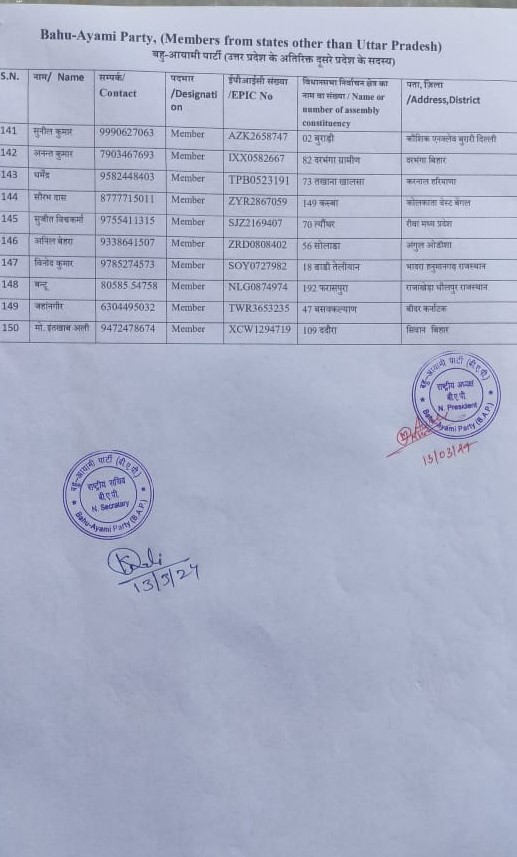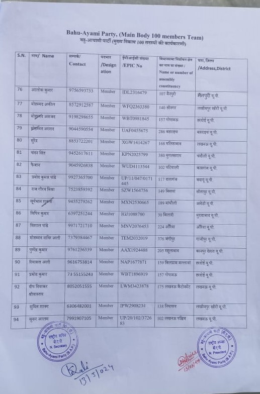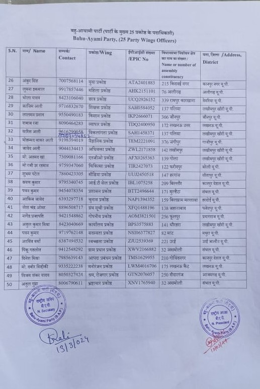 अंकुर सिंह जी कानपुर से युवा प्रकोष्ठ अध्यक्ष, लुबना इकबाल जी अलीगढ़ से महिला प्रकोष्ठ, भोला यादव जी देवरिया से छात्र प्रकोष्ठ, काजिम अली जी लखीमपुर खीरी से शिक्षक प्रकोष्ठ, लालमन प्रसाद जी जौनपुर से किसान प्रकोष्ठ, शबाब राजा जी लखनऊ से व्यापार प्रकोष्ठ, वारिस अली जी लखीमपुर खीरी से विकलांगता प्रकोष्ठ, मोहम्मद बाकर अली जी गाजीपुर से वैज्ञानिक प्रकोष्ठ, जावेद अली जी लखीमपुर खीरी से अधिवक्ता प्रकोष्ठ, मोहम्मद अहमद खान जी लखीमपुर खीरी से एनजीओ प्रकोष्ठ, मोहम्मद राजिउर रहमान जी बरेली से चिकित्सा प्रकोष्ठ, शुभम पटेल जी सीतापुर से मीडिया प्रकोष्ठ, श्रवण कुमार जी कानपुर देहात से आईटी सेल प्रकोष्ठ, पवन कुमार कठेरिया जी संभल से प्रशासन प्रकोष्ठ, आकिब जावेद जी हरदोई से चुनाव प्रकोष्ठ, नरेश चंद्र ओमर जी फतेहपुर से ग्रंथ सूची प्रकोष्ठ, नागेंद्र प्रजापति जी प्रयागराज से गोपनीयक प्रकोष्ठ, अतुल कुमार मिश्रा जी लखीमपुर खीरी से कार्यालय प्रकोष्ठ, पवन कुमार जी मथुरा से सदस्यता प्रकोष्ठ, अरविंद वर्मा जी उरई जालौन से स्वच्छता प्रकोष्ठ, पिंकू गहलोत जी संभल से ग्राम प्रधान प्रकोष्ठ, दिनेश मिश्रा जी कानपुर देहात से आपदा प्रबंधन प्रकोष्ठ