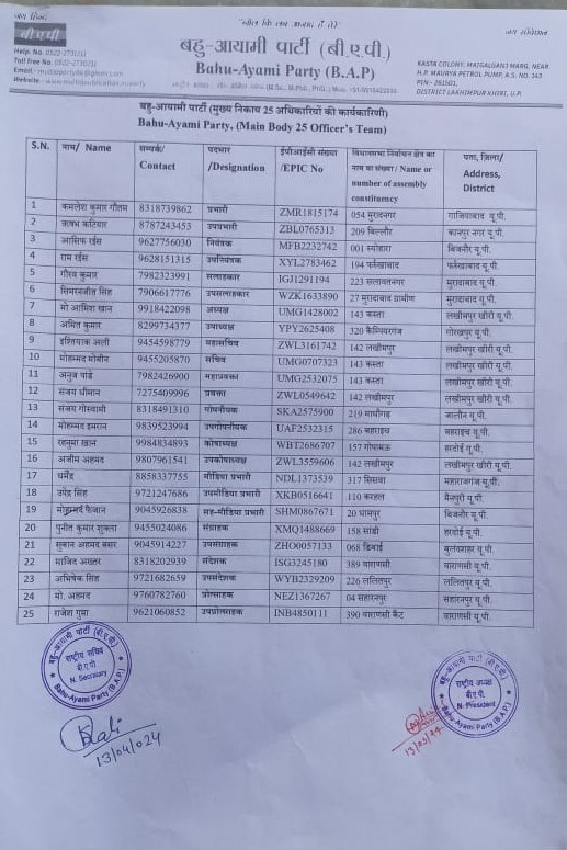 प्राप्त जानकारी के अनुसार बहुआयामी पार्टी में मुख्य 25 पदाधिकारियों को स्थान प्राप्त हुआ है वहीं पार्टी संविधान के अनुसार कुल 25 प्रकार के प्रकोष्ठों का गठन किया गया है , जिनमे 25 राष्ट्रीय प्रकोष्ठ अध्यक्ष मनोनीत किए गए हैं जबकि संवैधानिक रूप से पार्टी संगठनात्मक संरचना को आठ स्तरों में वर्गीकृत किया गया है l