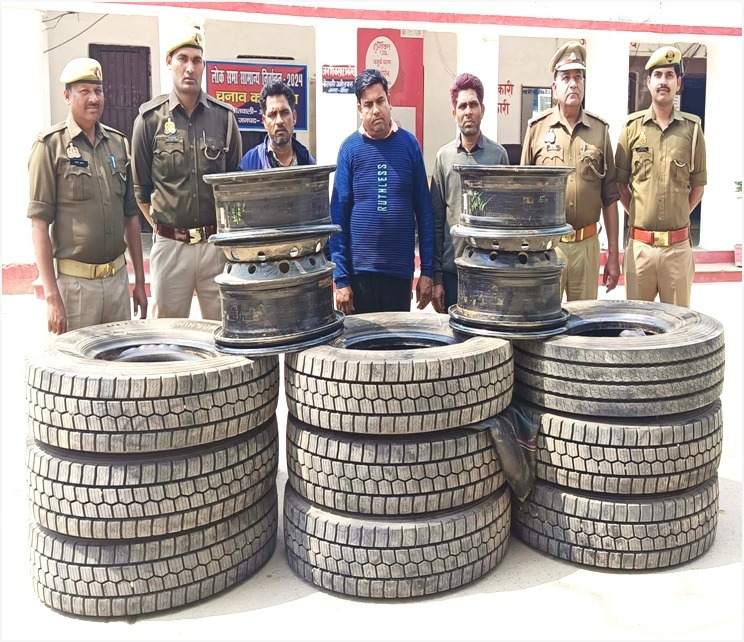 प्र०नि० राजकुमार सिंह द्वारा त्वरित कार्यवाही करते हुए माल व मुल्जिमान की शीघ्र अति शीघ्र बरामदगी/गिरफ्तारी के लिए थाना स्थानीय पर टीमें गठित की गयी गठित टीमों द्वारा पतारसी सुरागरसी करते हुए सोमवार/मंगलवार को करीब 02.05 बजे रात्रि को अभियुक्तगण मो0 इब्राहिम पुत्र मो0 अगनू निवासी वार्ड नं0-16 मोहल्ला दयालपुर थाना कोतवाली औरैया जनपद औरैया उम्र करीब 38 वर्ष, आबिद खान पुत्र पीरबक्स निवासी ग्राम सैनपुर पोस्ट बखरिया थाना कोतवाली औरैया जनपद औरैया उम्र करीब 35 वर्ष, पिन्टू उर्फ कपिल तिवारी पुत्र स्व० गिरिजाशंकर तिवारी निवासी कश्यपनगर थाना कल्यानपुर जनपद कानपुर नगर को सिद्धिविनायक होटल से थोड़ा आगे थाना क्षेत्र अजीतमल के पास से गिरफ्तार किया गया। अभियुक्तगण उपरोक्त के कब्जे से 09 अदद ट्रक के टायर, चार ट्रक रिम बरामद हुए। अभियुक्तगण उपरोक्त के कब्जे से टायर व रिम बरामदगी के आधार मुकदमा दर्ज किया गया। उपरोक्त में नामजद अभियक्त जसवीर सिंह पुत्र निर्मल सिंह निवासी दारापुर थाना सदर मोगा जिला मोगा पंजाब जो बादस्तूर फरार चल रहा है जिसकी शीघ्र अति शीघ्र गिरफ्तारी के लिए थाना स्थानीय पर टीमें गठित कर लगातार पतारसी सुरागरसी जारी है। अग्रिम विधिक कार्यवाही की जा रही है।