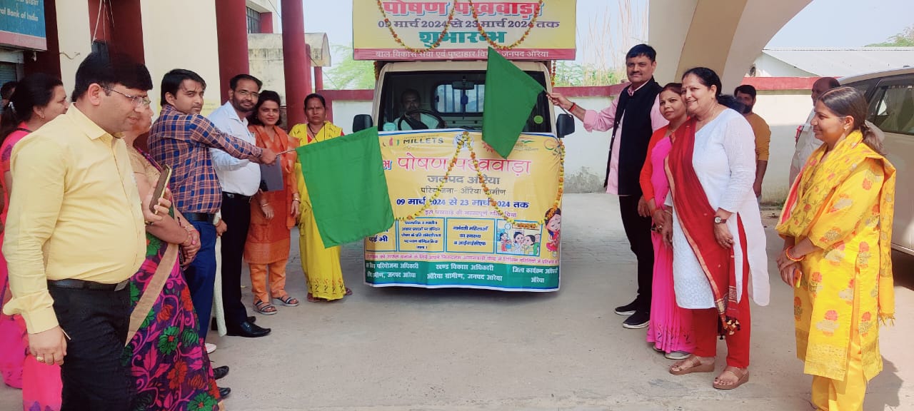 औरैया। विकास भवन सभागार ककोर औरैया में मुख्य विकास अधिकारी अनिल कुमार सिंह के द्वारा पोषण पखवाड़ा काठ सुभारम्भ किया गया, जिसमें मुख्य विकास अधिकारी द्वारा बताया गया कि पोषण पखावाड़ा के अन्तर्गत दिनांक- 23 मार्च 2024 तक आंगनबाड़ी केन्द्रों पर गतिविधियों का आयोजन किया जायेगा, मुख्य विकास अधिकारी के द्वारा हरी झण्डी दिखाकर पोषण वैन को जनपद में रवाना किया गया।