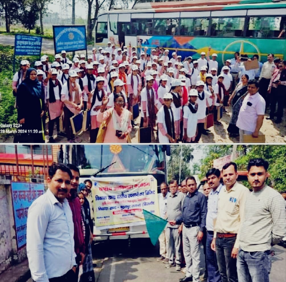 स्योहारा। ग्राम बुढ़नपुर में राष्ट्रीय आविष्कार कार्यक्रम के अंतर्गत एक्सपोजर विजिट हेतु विकासखंड स्तर पर विज्ञान प्रतियोगिता में चयनित 100 छात्र-छात्राओं एवं 20 अध्यापकों के दल को खंड शिक्षा अधिकारी दिनेश कुमार ने दो बसों को हरी झंडी दिखाकर रवाना किया।कृषि विज्ञान कार्यक्रम नगीना एवं शुगर मिल स्योहारा के लिए छात्रों को बैग में नाश्ते का सामान, पानी की बोतल ,लेटर पैड ,पेन इत्यादि के साथ विभाग द्वारा प्रदत्त कैप एवं टी शर्ट के साथ भेजा।