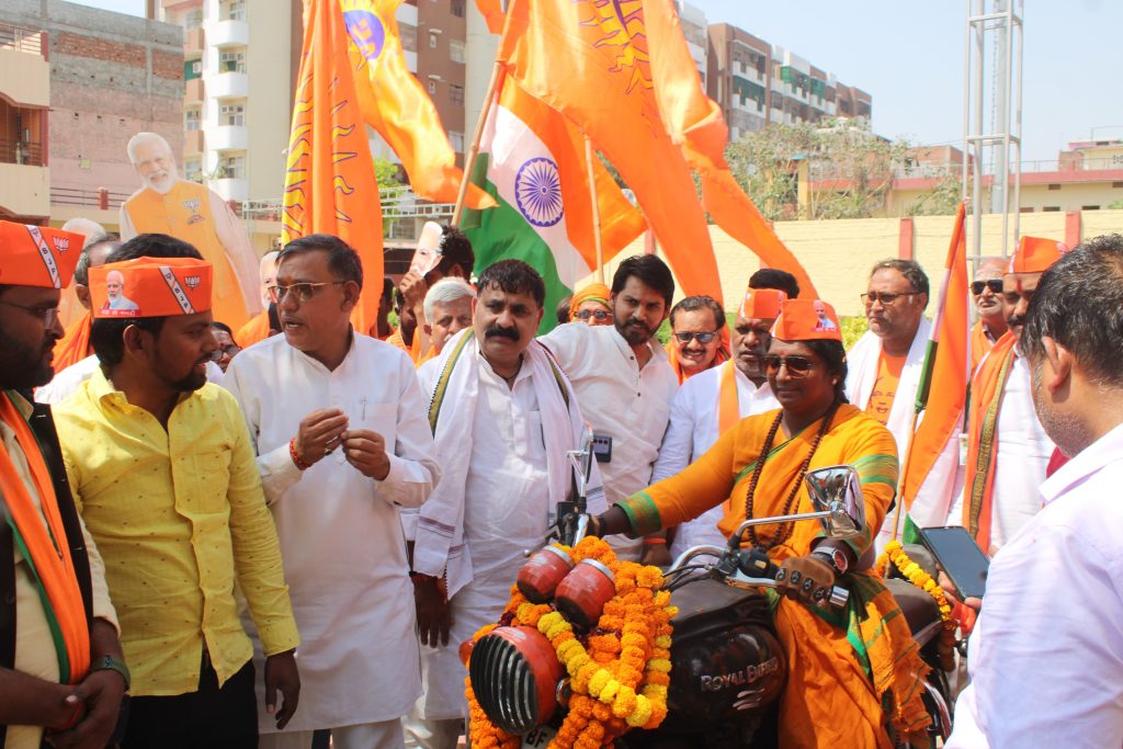वाराणसी 8 अप्रैल :- आगामी लोकसभा चुनाव के मद्देनजर नरेंद्र मोदी एवं भाजपा के पक्ष में मतदान करने के लिए और लोगों में मतदान के प्रति जागरूकता लाने के उद्देश्य से बुलेट रानी के नाम से विख्यात तमिलनाडु निवासिनी राजलक्ष्मी मंदा आज प्रधानमंत्री नरेंद्र मोदी के संसदीय क्षेत्र काशी पहुंची। वोट फॉर नेशन,वोट फॉर मोदी के उद्घोष के साथ बुलेट रानी राजलक्ष्मी मंदा के काशी पहुंचने पर एमएलसी व भाजपा जिलाध्यक्ष हंसराज विश्वकर्मा के नेतृत्व में भाजपा कार्यकर्ताओं द्वारा जोरदार स्वागत किया गया।