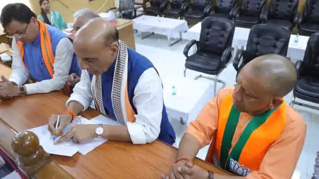रक्षा मंत्री राजनाथ सिंह ने सोमवार को लखनऊ लोकसभा सीट से नामांकन किया। इस दौरान यूपी के मुख्यमंत्री योगी आदित्यनाथ और उत्तराखंड के मुख्यमंत्री पुष्कर सिंह धामी सहित भाजपा के कई दिग्गज मौजूद रहे।