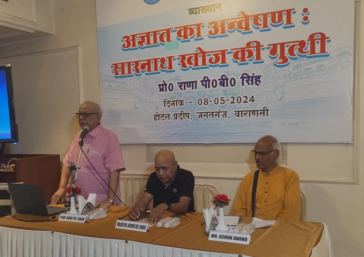 उपरोक्त बातें प्रोफेसर राणा पी बी सिंह ने स्लाइड शो के माध्यम से अशोक मिशन एजुकेशनल सोसाइटी द्वारा आयोजित एकल व्याख्यान के अंतर्गत “अज्ञात का अन्वेषण, सारनाथ खोज की गुत्थी विषय पर बोलते हुए वाराणसी के गाइडो के समक्ष 8 मई 2024 बुधवार की शाम लहुराबीर स्थित प्रदीप होटल में कहा |प्रोफेसर सिंह ने ‘लास्ट हीरो आफ बनारस बाबू जगत सिंह’ पुस्तक के तृतीय अध्याय का उल्लेख करते हुए सारनाथ में लगे शिलापट्ट पर अंकित विवरण को ठीक करने का अनुरोध भी भारत सरकार से किया |