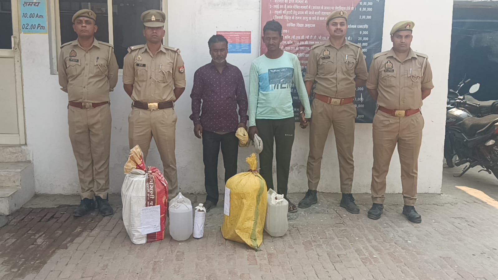 आज दिनांक 10.05.2024 को प्रभारी निरीक्षक श्री अशोक कुमार सिंह थाना निगोही के नेतृत्व मे थाना निगोही की पुलिस टीम द्वारा ग्राम ईशापुर में अलग अलग स्थानों से अभियुक्तगण 1.विजेन्दर पुत्र लाल सिंह निवासी ग्राम ईसापुर थाना निगोही जनपद शाहजहाँपुर 2. पप्पू पुत्र मोती निवासी ग्राम ईसापुर थाना निगोही जनपद शाहजहाँपुर को अवैध कच्ची शराब की कसीदगी करते हुए गिरफ्तार किया गया है। तथा अभियुक्तो के कब्जे से 20-20 ली0 अवैध शराब खाम मय अवैध शराब बनाने के उपकरणो सहित बरामद किया गया तथा करीब 100 लीटर लहन नष्ट किया गया । गिरफ्तार अभियुक्तो के विरूद्ध थाना हाजा पर मुकदमा पंजीकृत कर आवश्यक वैधानिक कार्यवाही की गयी ।