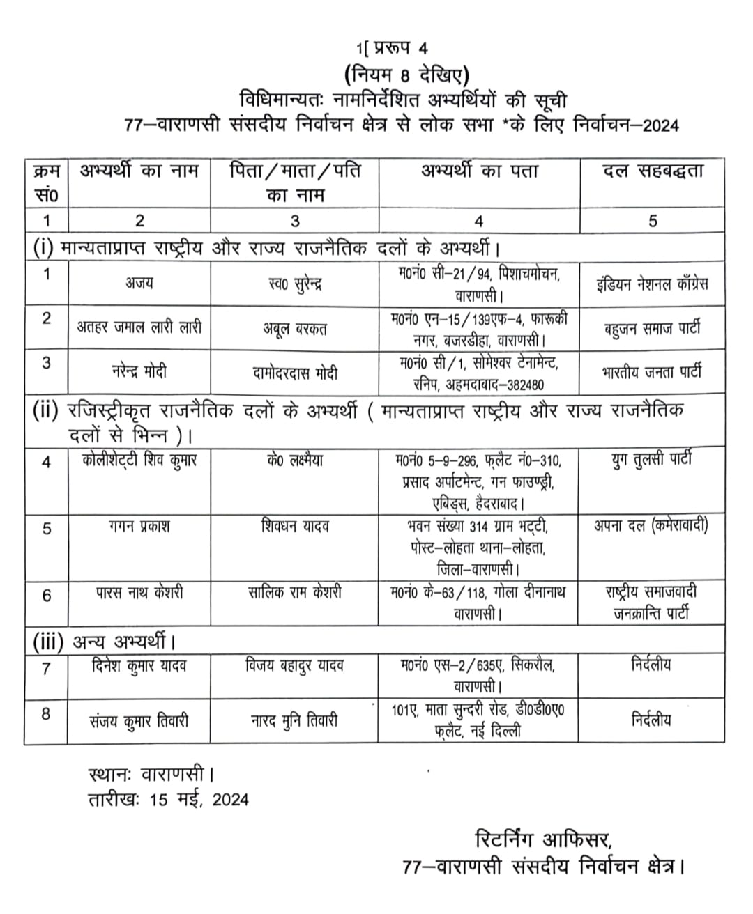 वैद्य नामांकन पत्रों में सर्वश्री नरेन्द्र मोदी-भारतीय जनता पार्टी, अजय-नेशनल इंडियन कांग्रेस, अतहर जमाल लारी-बहुजन समाज पार्टी, गगन प्रकाश-अपना दल (कमेरावादी), पारस नाथ केशरी-राष्ट्रीय समाजवादी जन क्रांति पार्टी, कोली शेट्टी शिवकुमार- युग तुलसी पार्टी, संजय कुमार तिवारी-निर्दल तथा दिनेश कुमार यादव-निर्दल का नामांकन पत्र हैं।