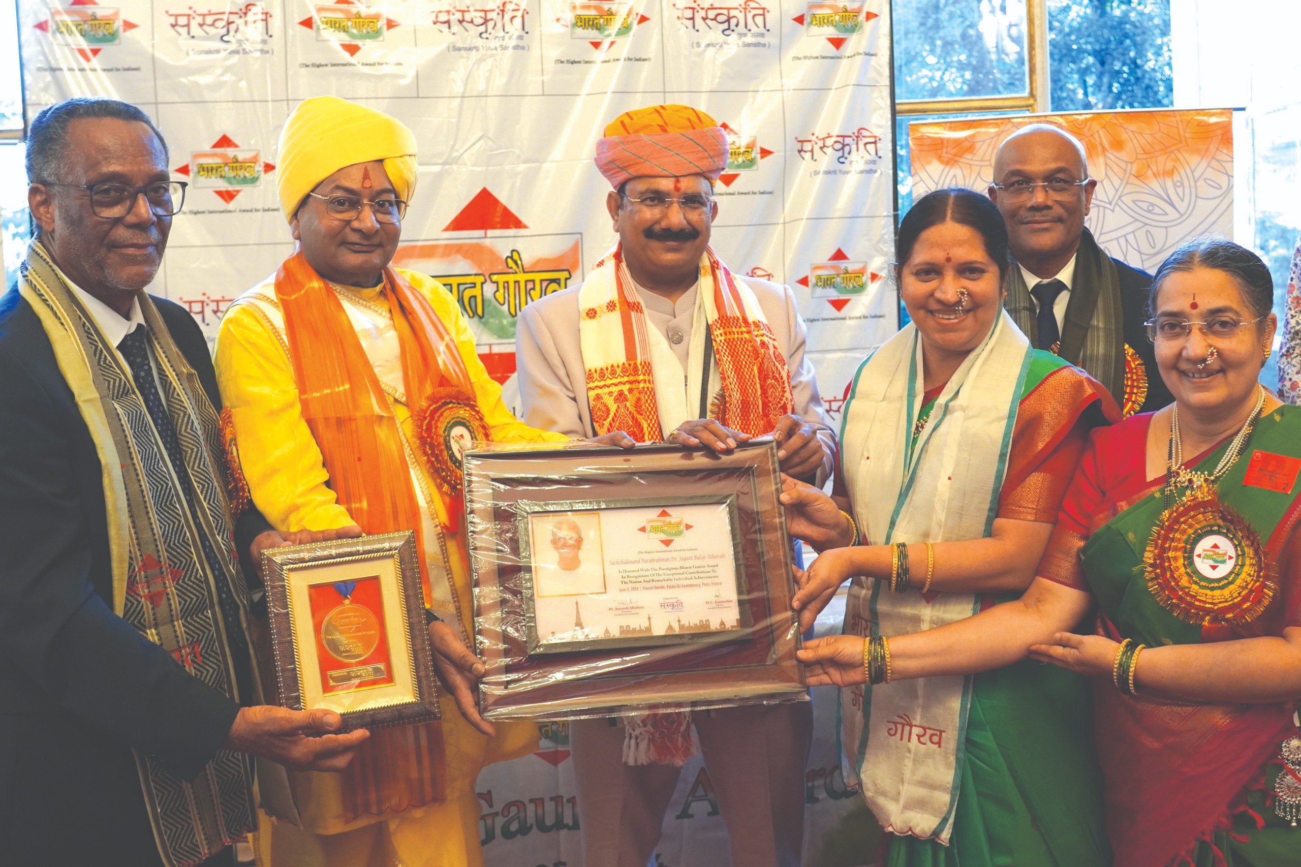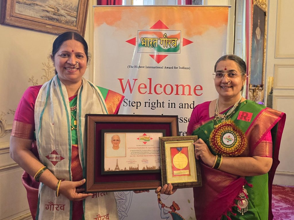 पैरिस (फ्रान्स)- अखिल मानवजाति के कल्याण के लिए निरंतर प्रयासरत, साधना से संबंधित दिशादर्शन कर संपूर्ण संसार के साधकों का जीवन आनंदमय बनानेवाले, विज्ञानयुग में सरल भाषा में अध्यात्म का प्रसार कर समाज का दिशादर्शन करनेवाले सनातन संस्था के संस्थापक सच्चिदानंद परब्रह्म डॉ. जयंत आठवलेजी को 5 जून 2024 को फ्रान्स के सीनेट में (संसद में) ‘भारत गौरव पुरस्कार’ से सम्मानित किया गया । फ्रेंच संसद के उपाध्यक्ष डॉमिनिक थिओफिल, मेहंदीपुर बालाजी ट्रस्ट के श्री नरेश पुरी महाराज, ‘संस्कृति युवा संस्था’ के अध्यक्ष पं. सुरेश मिश्रा एवं फ्रेंच संसद सदस्य फ्रेडरिक बुवेल के करकमलों से भारतीय संस्कृति एवं सभ्यता के जागतिक प्रसार के लिए किए गए अद्वितीय योगदान के लिए उन्हें यह पुरस्कार दिया गया । सच्चिदानंद परब्रह्म डॉ. जयंत आठवलेजी की ओर से उनकी आध्यात्मिक उत्तराधिकारिणी श्रीसत्शक्ति (श्रीमती) बिंदा सिंगबाळ एवं श्रीचित्शक्ति (श्रीमती) अंजली गाडगीळजी ने यह पुरस्कार स्वीकार किया । ‘संस्कृति युवा संस्था’ ने इस पुरस्कार के लिए सच्चिदानंद परब्रह्म डॉ. जयंत आठवलेजी का चयन किया था ।