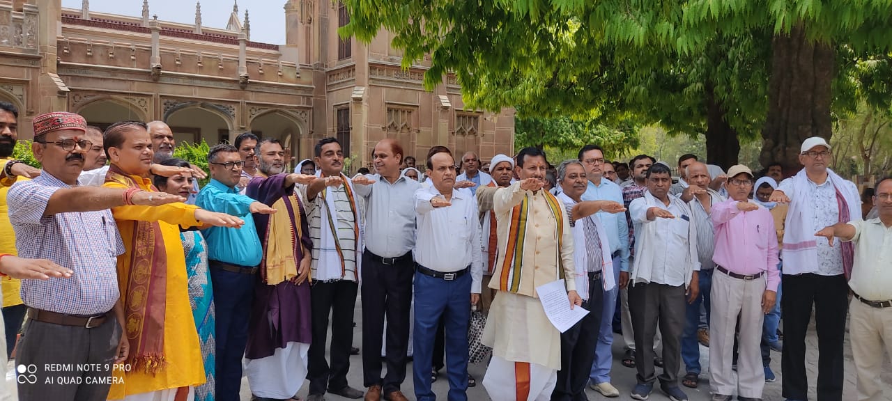 उक्त विचार सम्पूर्णानन्द संस्कृत विश्वविद्यालय, वाराणसी के कुलपति प्रो बिहारी लाल शर्मा ने आज एतिहासिक मुख्य भवन के समक्ष विश्वविद्यालय परिवार के आचार्यों, अधिकारियों, कर्मचरियों एवं विद्यार्थियो को आगामी योग दिवस हेतु प्रत्येक परिवार, पड़ोसी, समाज आदि को जोड़ने के शपथ दिलाकर संकल्पबद्ध किया।