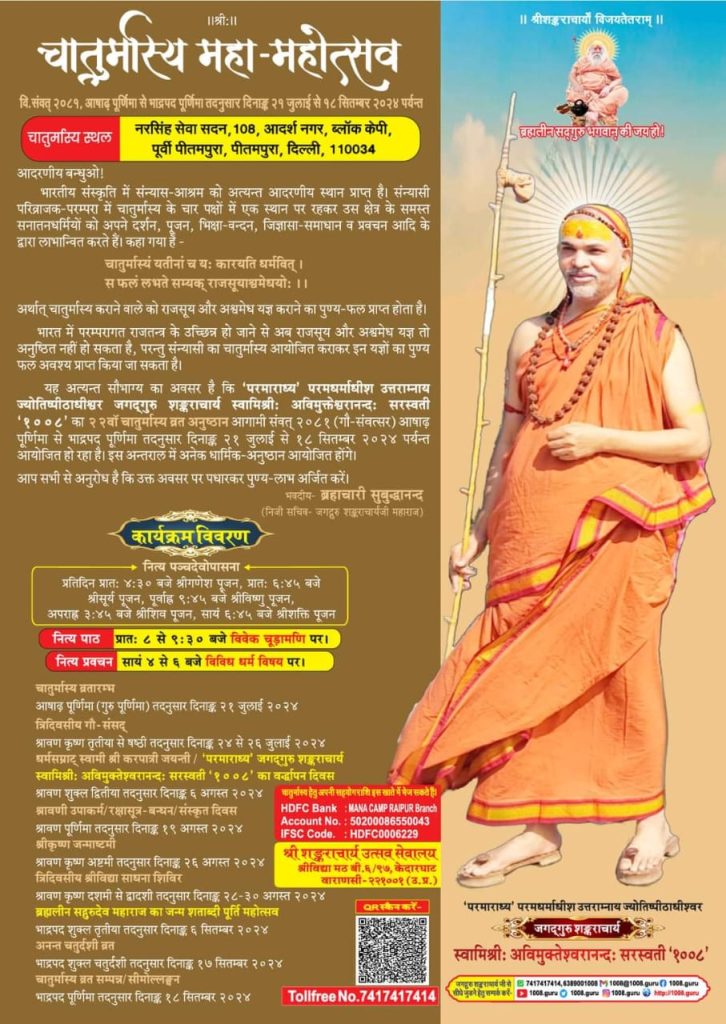वाराणसी परमाराध्य परमधर्मधर्माधीश ज्योतिष्पीठाधीश्वर जगदगुरु शंकराचार्य स्वामिश्री: अविमुक्तेश्वरानंद: सरस्वती 1008 जी महाराज का 22वां चातुर्मास्य व्रत महामहोत्सव इस बार आगामी संवत 2081गौ सम्वत्सर आषाढ़ पूर्णिमा से भाद्रपद पूर्णिमा तदनुसार दिनांक 21 जुलाई से 18 सितंबर तक दिल्ली में आयोजित होंगे।इस दौरान विभिन्न धर्मानुष्ठान सम्पन्न किए जाएंगे।इस सूचना से अवगत होने पर दिल्ली व आसपास के क्षेत्रों के भक्तों में हर्ष की लहर दौड़ पड़ी है।