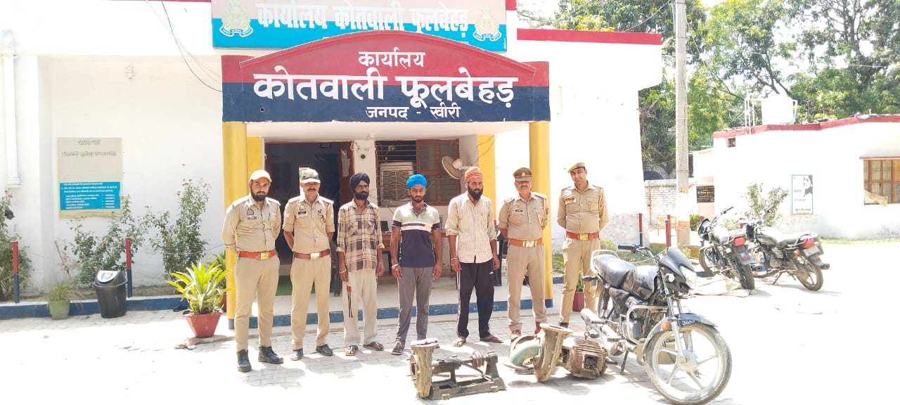 लखीमपुर : पुलिस अधीक्षक खीरी, गणेश प्रसाद साहा के निर्देशन व अपर पुलिस अधीक्षक खीरी के निकट पर्यवेक्षण में संपूर्ण जनपद में अपराध की रोकथाम व अपराधियों की गिरफ्तारी हेतु चलाए जा रहे अभियान के अंतर्गत थाना फूलबेहड़ पुलिस द्वारा आज दिनांक 17.06.2024 को चोरी की योजना बनाते हुए 03 अभियुक्तों 1. निशान सिंह पुत्र नगेन्द्र पाल सिंह निवासी ग्राम मनठऊपुरवा मजरा मुडिया पूजागांव थाना फूलबेहड़ जनपद खीरी 2. निशान सिंह पुत्र वक्शीष सिंह नि0ग्राम जहानपुर थाना फूलबेहड़ जनपद खीरी 3. जगदीप सिंह पुत्र प्रकट सिंह नि0ग्राम मनठऊपुरवा थाना फूलबेहड़ जनपद खीरी हाल पता नि0 सिन्धिया फार्म थाना फूलबेहड़ जनपद खीरी को चोरी के माल व 01 अदद मोटरसाइकिल सहित गिरफ्तार किया गया। उक्त गिरफ्तारी व बरामदगी के संबंध में थाना फूलबेहड़ पर मु0अ0सं0 261/24 धारा 401/411/413/414 भादवि0 में अभियोग पंजीकृत कर अभियुक्तों का चालान मा0 न्यायालय के समक्ष भेजा जा रहा है ।
