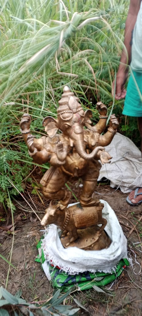 लखीमपुर खीरी जिले के थाना खीरी के अंतर्गत मोहम्मदाबाद गांव के शहीद बाबा मजार के पास का है। जहां गुरुवार को खेत गए किसान को खेत में बंद बोरी दिखी है। जैसे ही बंद बोरी को खोला गया किसान के होश उड़ गए। खेत में पड़ी बोरी में के अंदर भगवान गणेश की बेशकीमती मूर्ति देखी गई है। मूर्ति मिलने के बाद गांव के लोग एकत्र हो गए। ग्रामीणों ने मामले की सूचना पुलिस को दी है मौके पर पहुंची पुलिस ने मूर्ति को अपने कब्जे में ले लिया है। और मामले की जांच कर रही है। मूर्ति अष्टधातु की बताई जा रही है।