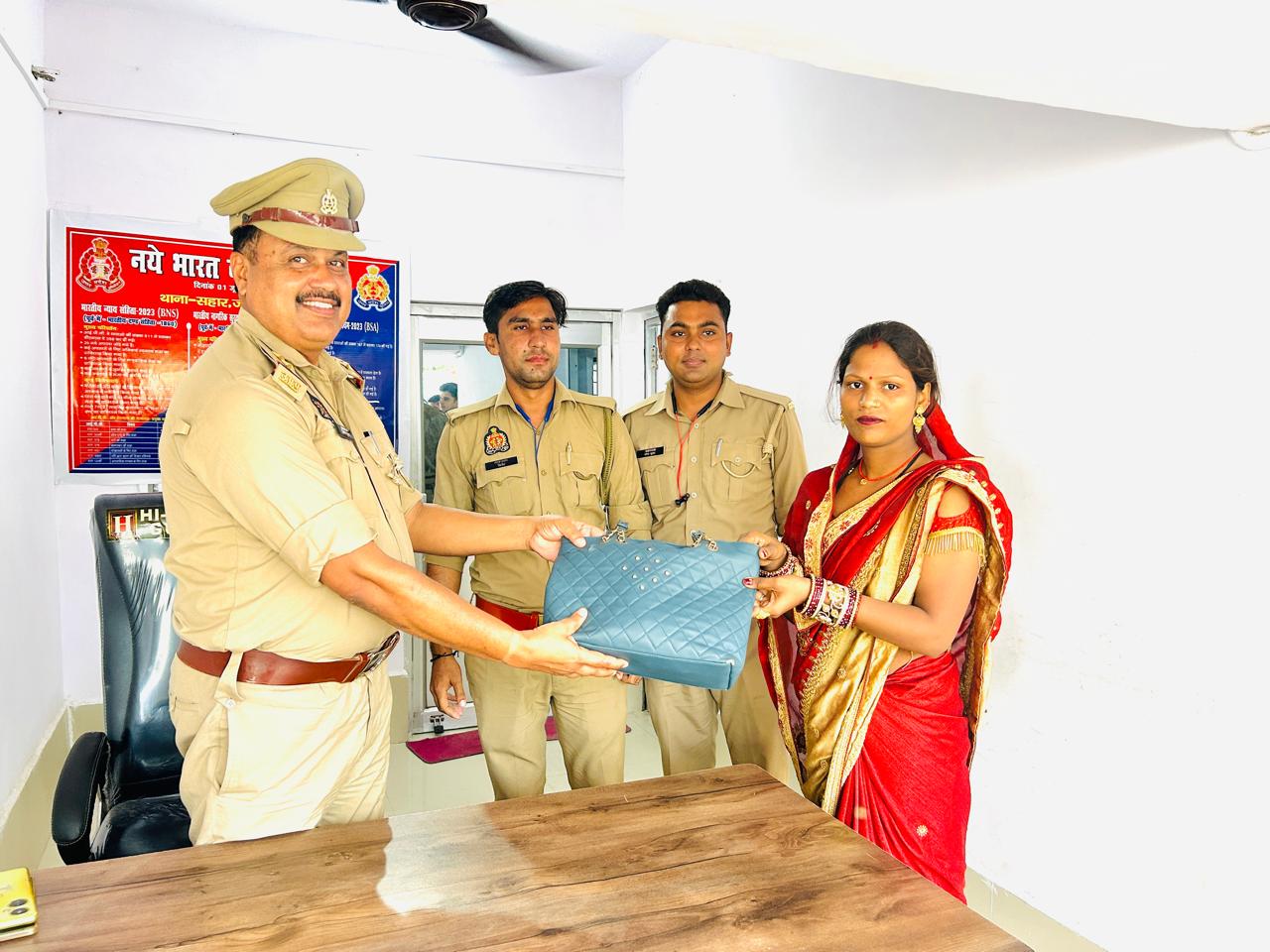 सहार -औरैया सहार थानाध्यक्ष विनोद कुमार को सूचना मिली कि एक महिला बंदना पत्नी मोनू पलिया मकनपुर से अपनी बुआ के घर शाहबाजपुर आ रही थी उसका पर्स रास्ते मे गुम हो गया है जिसमे सोने चांदी के ज़ेवर,नकद रुपए तथा एक मोबाइल था थानाध्यक्ष ने ततपरता दिखाते हुए मोबाइल का लोकेशन मगाया।और मात्र दो घंटे के अंदर गुम हुआ पर्स मय सामान महिला बंदना को सुपुर्द किया जिससेमहिला के चेहरे पर ख़ुशी दिखाई दी महिला ने सहार पुलिस की प्रशंसा करते हुए धन्यवाद दिया!पर्स बरामद करने मे थानाध्यक्ष विनोद कुमार, का हरेंद्र कुमार राजपूत, की भूमिका अहम रही!