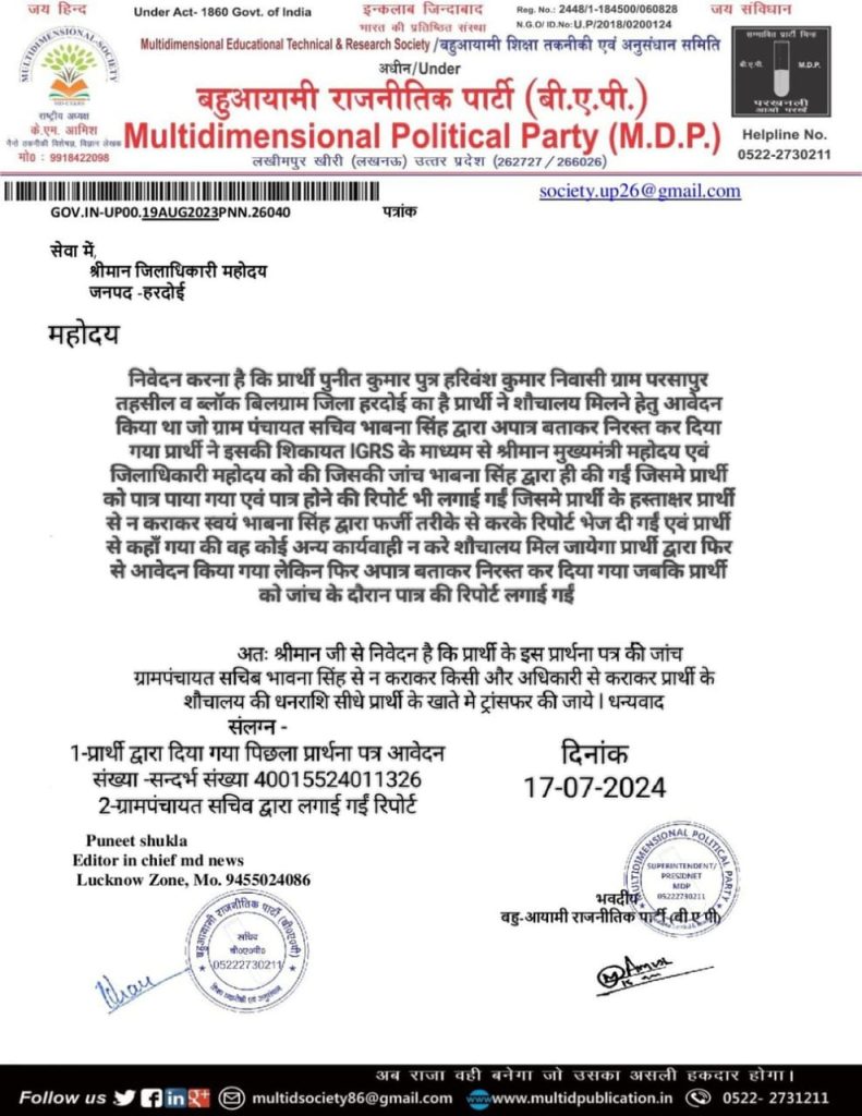 हरदोई।आपको बताते चले विलग्राम ब्लॉक के अंतर्गत ग्रामपंचायत परसापुर में igrs में पात्र होने की रिपोर्ट लगाकर ग्राम प्रधान एवं ग्रामपंचायत सचिव द्वारा शौचालय हेतु आवेदन अपात्र बताकर निरस्त कर दिया गया l मिली जानकारी के अनुसार आवेदक पुनीत कुमार ने वताया कि मेरे द्वारा शौचालय हेतु आवेदन किया गया लेकिन ग्राम प्रधान एवं ग्रामपंचायत सचिव द्वारा अपात्र बताकर निरस्त कर दिया गया तब आवेदक ने IGRS के माध्यम से श्रीमान मुख्यमंत्री महोदय एवं जिलाधिकारी महोदय को ऑनलाइन शिकायत की।