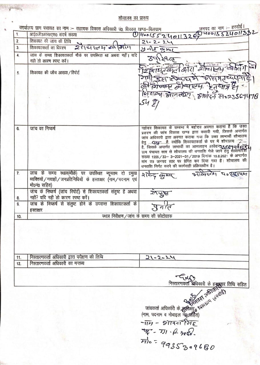 शिकायत की जांच स्वयं ग्रामपंचायत सचिव को मिली जिसमे ग्रामपंचायत सचिव द्वारा आवेदक को शौचालय हेतु पात्र दिखाते हुये रिपोर्ट लगाई गईं एवं आवेदक से फोन द्वारा कहाँ गया आप शौचालय हेतु पात्र है आपको शौचालय उपलब्ध करा दिया जायेगा ।आप अब आगे कार्यवाही न करे और दोवारा आवेदन करवा दे प्रार्थी द्वारा अब तक चार वार आवेदन किया जा चुका है लेकिन हर बार आवेदन अपात्र वताकर निरस्त कर दिया जाता है l इससे परेशान होकर प्रार्थी ने फिर igrs के माध्यम से श्रीमान जिलाधिकारी महोदय हरदोई से गुहार लगाई है सवाल यह है एक तरफ पात्र की रिपोर्ट लगाकर उसी को अपात्र बताना सीधे अधिकारियों की मनमानी है l देखते है इस मामले में उच्चअधिकारी क्या कार्यवाही करते है।