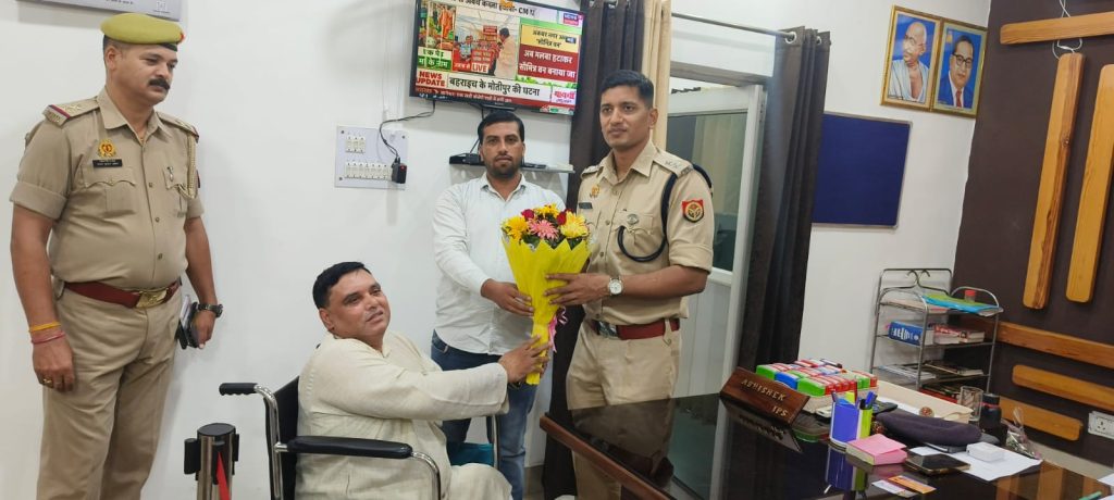 स्योहारा। राष्ट्रीय विकलांग एसोसिएशन के संस्थापक / राष्ट्रीय अध्यक्ष व सामान्य लोकसभा चुनाव 2024 के ब्रांड एंबेसडर एमआर पाशा ने शनिवार को पुलिस अधीक्षक बिजनौर कार्यालय में पहुंचकर नवागत लोकप्रिय पुलिस अधीक्षक अभिषेक झा को गुलदस्ता देकर बधाई दी।