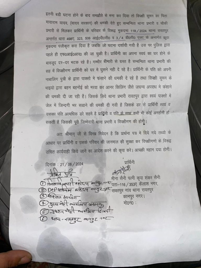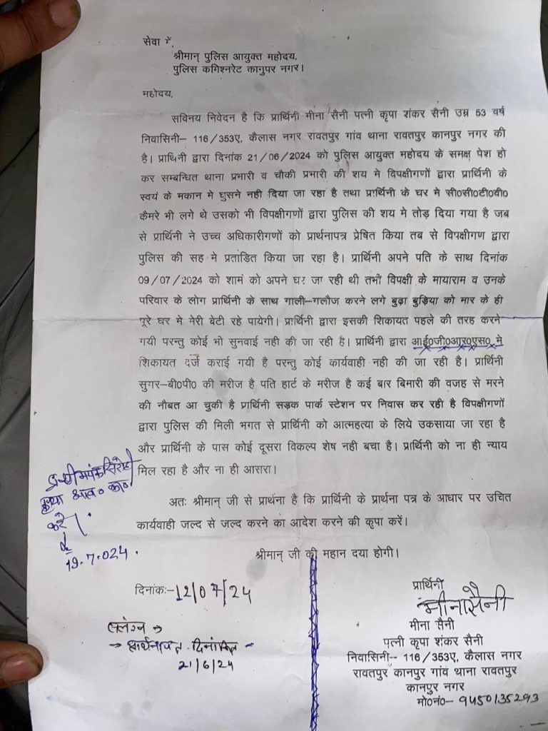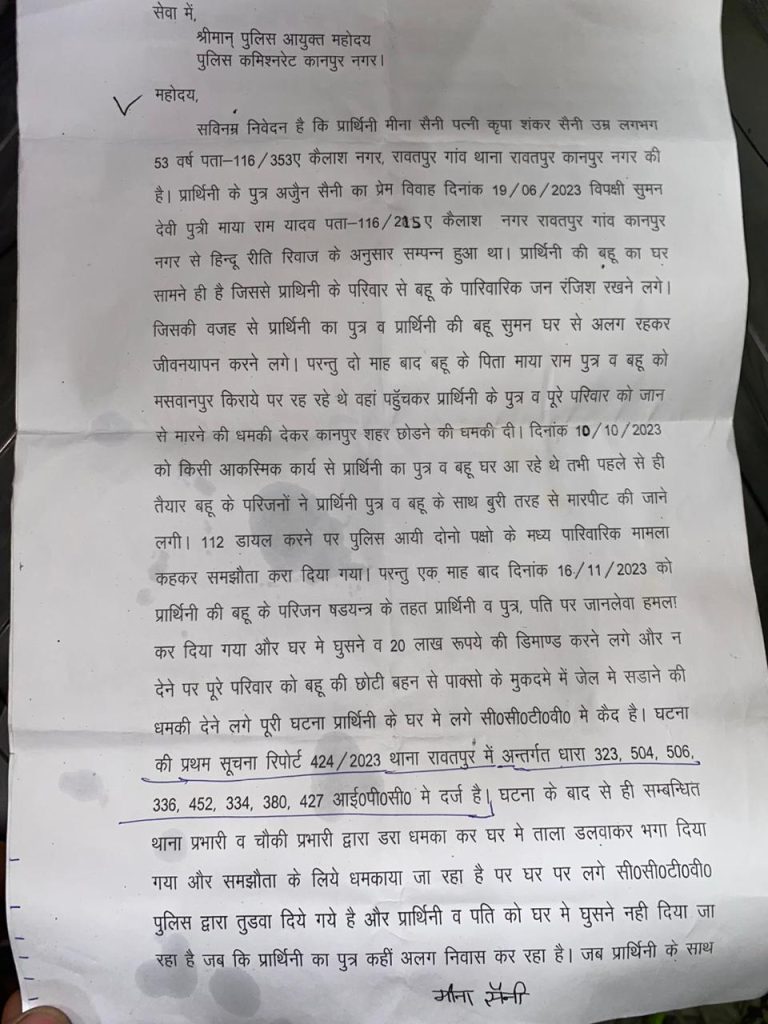 कानपुर – रावतपुर थाना क्षेत्र में इंसानियत कों शर्मसार करने वाली घटना आयी सामने जहां कलयुगी बहू ने अपने वृद्ध सास ससुर कों घर से बाहर निकालकर घर में ताला लगा दिया जिससे वृद्ध सास ससुर दर दर की ठोकर खाने कों हुये मजबूर। पीड़ित कृपाशंकर सैनी व उनकी पत्नी मीना सैनी ने थाने से लेकर पुलिस कमिश्नर तक न्याय की गुहार लगायी लेकिन उन्हें न्याय नही मिला। आपकों बताते चले की पीड़ित कृपा शंकर सैनी का पुत्र अर्जुन सैनी ने पड़ोस में रहने वाली सुमन यादव से प्रेम विवाह कर लिया और शादी कों रजिस्टार कार्यालय से पंजीकृत कराकर घर में हंसी खुशी रहने लगे। कुछ समय पश्चात् सुमन यादव ने अपने मायके भाई दूज पर जाने की जिद की जिस पर अर्जुन ने सुमन कों मायके भेज दिया। मायके से आने के बाद सुमन आये दिन लड़ाई झगड़ा करने लगी जिससे तंग आकर कृपा शंकर सैनी ने अपने बेटा व बहू कों अपनी चल अचल संपत्ति से बेदखल कर दिया। उसके बाद से सुमन के मायके वाले कृपा शंकर कों तरह तरह से परेशान करने लगे और बहू सुमन की नाबालिग़ बहन कों आगे कर पाक्सो एक्ट में फंसाने का बराबर प्रयास कर रहे हैं जिससे घबराकर कृपा शंकर सैनी व उनकी पत्नी अपनी रिश्तेदारी में चले गये और यहाँ बहू के घर वालों ने घर में ताला लगा दिया जबसे कृपा शंकर सैनी व उनकी पत्नी दर दर की ठोकर खाने कों मजबूर हैं और अपने हीं घर में दबंगों की दबंगई के कारण नही घुस पा रहे हैं।मुकेश विश्वकर्मा