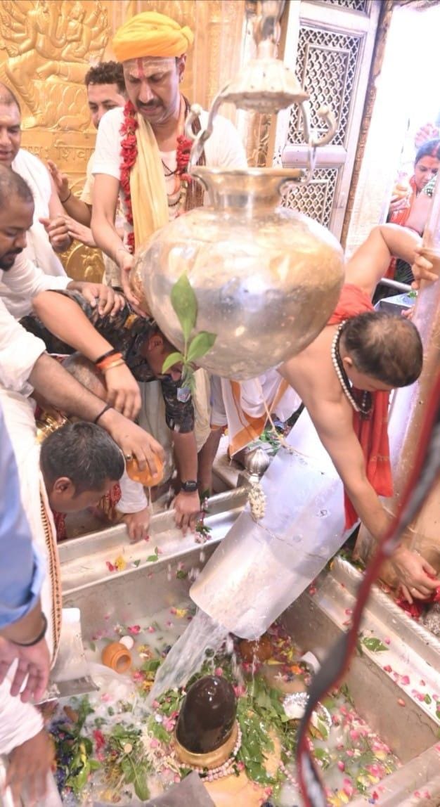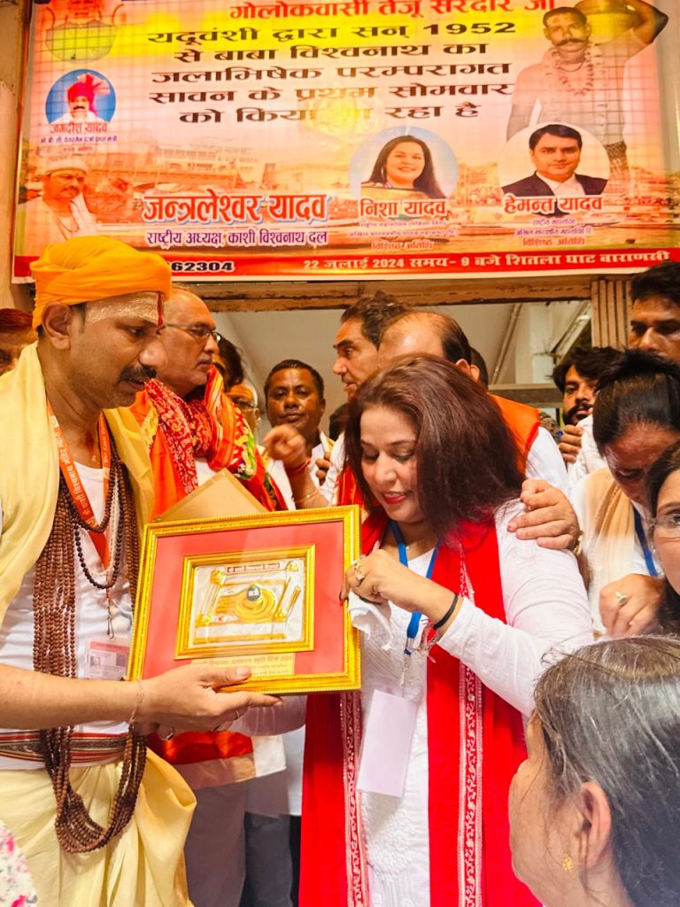 आज दिनांक 22 जुलाई 2024 सावन के प्रथम सोमवार को बाबा विश्वनाथ को जलाभिषेक काशी विश्वनाथ दल के राष्ट्रीय अध्यक्ष जंत्रलेश्वर यादव के प्रधान कार्यालय पर मुख्य अतिथि जगदीश यादव जी ओ.बी.सी. चेयरमैन (राजयमंत्री दर्जा प्राप्त) एवं संरक्षक पूर्व मंत्री मनोज यादव विशिष्ठ अतिथि निशा यादव एवं हेमंत यादव को काशी विश्वनाथ दल अलंकरण स्मृति चिन्ह 2024 देकर अंग वस्त्रम ओढ़ाकर माल्यार्पण कर स्वस्ति वचन के साथ तिलक लगाकर अभिनन्दन किया गया । एवं महाश्मशान से आये वाद्य डमरू दाल को भी सम्मानित किया गया ततपश्चात काशी विश्वनाथ दल के प्रधान कार्यालय से हर हर महादेव के उद्घोष के साथ बाबा के अतिप्रिय डमरु वाद के पीछे सभी शिव भक्त हौज कटोरा, गोदौलिया चौराहा होते हुये अपने निश्चित समय पर शीतला घाट पहुंचे वहाँ पर सभी यादव समाज के लोगो ने माँ गंगा का पूजन और अर्चन किया तत्पश्चात अपने गगरी में जल भर कर माता शीतला को जलाभिषेक कर पुनः गगरी में जल भर कर स्व॰ तेजू सरदार जी द्वारा लिखे दोहा को बोलकर डेडसी पूल होते हुये ढूंढी राज गणेश पहुंच कर हर हर महादेव के उद्घोष के साथ जलाभिषेक कर मां अन्नपूर्णा के दरबार में पहुंचकर विधिवत पूजन-अर्चन करते हुये परिक्रमा के साथ बाबा के धाम में पहुँचकर समस्त यादव बँधु हर हर महादेव का उद्धघोष करने लगे बाबा बाबा सब कहे, दोहा बोलते हुये इसके बाद यादव बँधु नियमानुसार जैसा की शाशन प्रशाशन एवं विश्वनाथ मंदिर ने तै किया था दोनों समूहों के लिए 21 एवं 15 इसी के अनुसार क्रम से जंत्रलेस्वर यादव एवं दर्जा प्राप्त मंत्री ओ.बी.सी. चेयरमैन के अगुआई में गर्भगृह में चयनित लोग बाबा बाबा सब कहे, माई कहे न कोय। बाबा के दरबार में, माई कहे सो होय। बोलकर जलाभिषेक किये ।