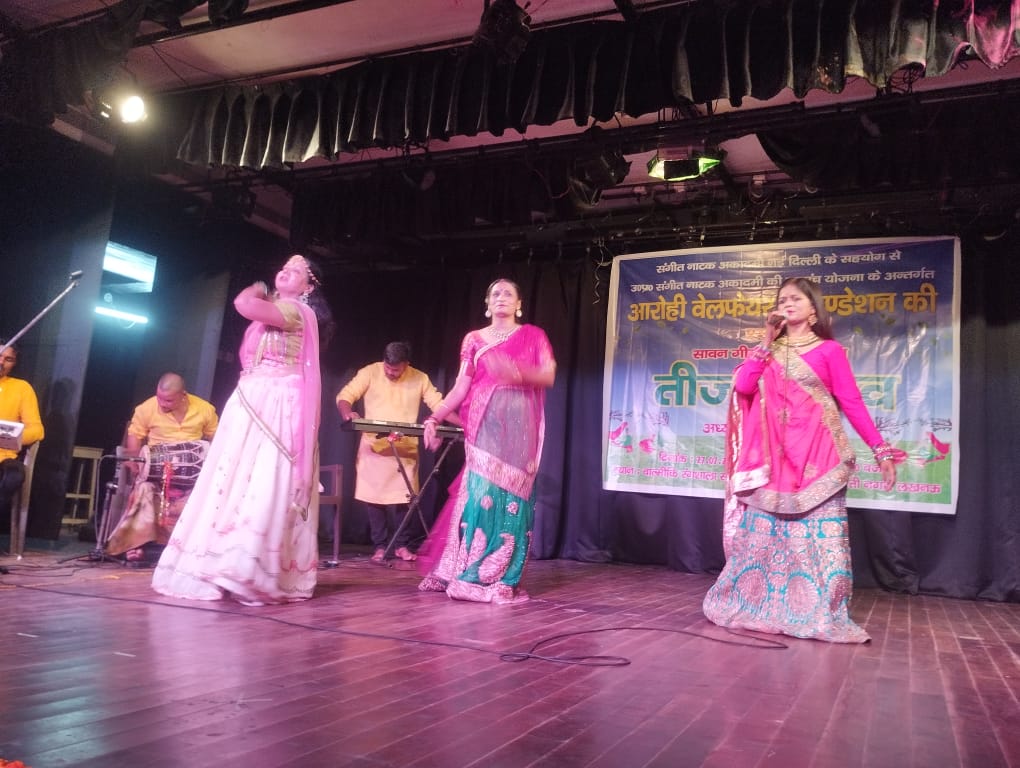 आरोही के कजरी उत्सव में गूंजा “बदरा घेरी-घेरी आई ननदी”लखनऊ शनिवार 27 जुलाई। आरोही वेलफेयर फाउंडेशन की ओर से कजरी तीज उत्सव का आयोजन शनिवार 27 जुलाई को गोमती नगर स्थित संगीत नाटक अकादमी परिसर के वाल्मीकि ऑडिटोरियम में किया गया। यूपीएसएनए की “रंसमंच” योजना के तहत हुए सावन की फुहार कार्यक्रम में आरोही वेलफेयर फाउंडेशन की सचिव मोना चंद्र ने दर्शकों का स्वागत-अभिनंदन किया। इसके उपरांत लोक गायिका शिप्रा ने राम भजन “मेरे राम आए हैं प्रभु राम आए हैं” सुनाकर समारोह की भक्तिमय शुरुआत की।सावन का महीना भगवान शंकर को बहुत प्रिय है। ऐसे में विशेष रूप से भजन “भोले डम-डम डमरू बजाए रहे है सुनाकर कलाकारों ने प्रशंसा हासिल की। इसके साथ ही झूला और कजरी गीत भी सुनाए गए। बदरा घेरी-घेरी आई ननदी, रिमझिम बरसे बूंद बूंदनियां सइयां नाही आए, झूला झूले जइबे हम नहरवा, भइया झूला डारे होइहे जैसे विभिन्न सरस और ऋतु अनुकूल लोकगीतों ने समारोह को परवान चढ़ाया। सुमधुर लोकगीतों पर कलाकारों ने सुंदर नृत्य संयोजन भी पेश कर तालियां बटोंरी। नृत्य दल में जया, अनुष्का, मोनिका, मंजुल, भाव्या मित्तल, आराध्य शामिल रहे। इसमें की-बोर्ड पर शंकी, ढोलक पर रजत, आक्टोपैड पर अभिषेक सहित अमित मोहन सहयोगी कलाकार रहे जबकि गायन का दायित्व ऐश्वर्य, चंद्रा, विभा शुक्ला, अंजली गुप्ता ने बखूबी निभाया।