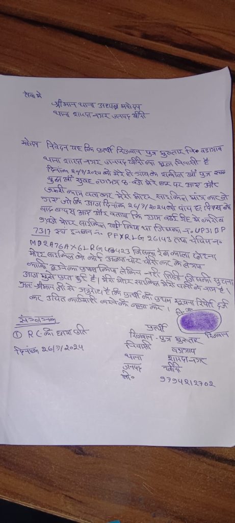 लखीमपुर खीरी के थाना शारदा नगर के क्षेत्र ग्राम पंचायत बड़ागांव के निवासी रिजवान पुत्र मुख्तार की मोटर साइकिल दिनांक 20/7/2024 को करीब सुबह 8 बजे गांव के ही निवासी शकील पुत्र बुद्धा जरूरी काम बताकर पीड़ित की मोटर साइकिल मांग कर ले गए। जब शाम को मोटर साइकिल घर वापस नहीं लौटी तो पीड़ित ने फोन करके अपनी मोटर साइकिल मांगी तो विपक्षी ने बताया कुछ जरूरी काम है उसे निपटाकर वापस कर देंगे लेकिन मोटर साइकिल वापस नहीं किया करीब 5 दिवस के बाद दिनांक 26/7/2024 को बताया की मैं बड़ाईडीह को गया था जहां से मोटर साइकिल चोरी हो गई थी लेकिन तुम लोगों से कोई मतलब नहीं है मैंने अपने दोस्त के साथ बैठकर एक रणनीत तैयार की है। जिसमे मैं अपने गांव के निवासी दो व्यक्ति एवं कुछ बड़ाईडीह के लोगों के खिलाफ प्रार्थनापत्र दे चुका हूं और इन लोगों से मोटी रकम वसूल करूंगा क्योंकि सारे लोग अपनी बेजती से डरते हैं और मेरे दोस्त की थाने पर काफी चलती है जो चाहूंगा वही होगा। लेकिन पीड़ित इस बात पर राजी नहीं हुआ और थाने पर प्रार्थना पत्र देकर एफ आई आर दर्ज कराई है। जब की शकील अपने तीनों भाइयों के साथ हमेशा जुआं खेलता है जिससे ज्ञात होता है कि मोटर साइकिल बेच कर जुआं में हार गया है। और इधर उधर प्रार्थना पत्र देकर अपना मालिकाना हक जता कर पुलिस को गुमराह कर रहा है। जब की मोटर साइकिल रिजवान की पत्नी गुलनाज पुत्री मुन्ना के नाम पर दर्ज है।