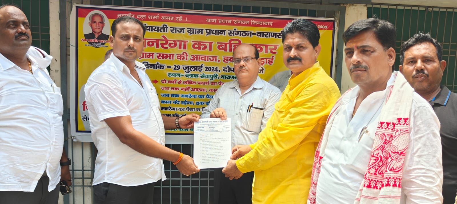 वाराणसी :- जिले के आठो ब्लॉक पर 2 वर्ष से मनरेगा पदार्थ का पैसा बकाया लगभग 23 करोड़ रूपया न मिलने पर 29 जुलाई सोमवार को समय 11:00 दिन में मनरेगा के पदार्थ का पैसा ना मिलने के कारण 694 ग्राम प्रधानों में आक्रोश वाराणसी जिले में प्रदर्शन किया गया | ग्राम प्रधान पिछले दो वर्षों से मनरेगा के अंतर्गत किए गए कार्यों का भुगतान न होने के कारण आक्रोशित हैं जिले के आठों ब्लॉक में लगभग 23 करोड़ रुपये का भुगतान लंबित है जिसके कारण ग्राम सभा के विकास कार्य बाधित हो रहे हैं | प्रधानों पर शासन द्वारा आंगनवाड़ी, गोदाम,पंचायत भवन,खेलकूद बाउंड्री आदि कार्यों का दबाव है लेकिन भुगतान न होने से ये कार्य रुके हुए हैं |