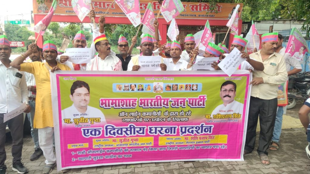 वाराणसी :- भामाशाह पार्टी द्वारा कचहरी वरुणा पुल स्थित शास्त्री घाट पर 31 जुलाई बुधवार को किया गया एक दिवसीय धरना प्रदर्शन धरने का संचालन संदीप जायसवाल ने किया | मुख्य अतिथि भामाशाह पार्टी अध्यक्ष सुजित गुप्ता ने कहा कि भामाशाह पार्टी बनिया समाज मे रहने वाले गरीब लड़कियों की शादी से लेकर सुरक्षा तथा आज ऑनलाइन कंपनियों के द्वारा बनिया दुकानदार ठेला पटरी पर समान बेचकर अपनी जीविकोपार्जन करती है | पिछले कुछ वर्षों से पूरे देश में ऑनलाइन कंपनी के माध्यम से बढ़ रहे खरीदारी से परेशान व्यापारियों की हक की आवाज उठाते हुए विदेशी आनलाइन कंपनियों को तत्काल बंद करने की मांग करते है |
