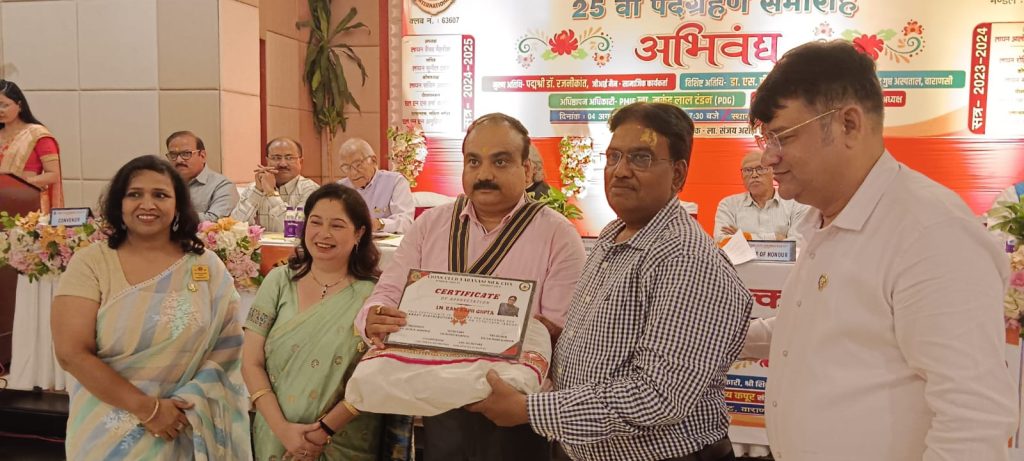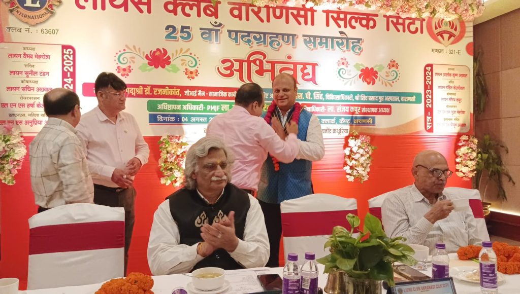 वाराणसी लायंस क्लब वाराणसी सिल्क सिटी का 25 वॉ पदग्रहण समारोह दिनांक 04/08/2024 रविवार को होटल क्लार्क्स ,कैंटोनमेंट में सम्पन्न हुआ । मुख्य अतिथि पद्मश्री डॉ रजनीकांतजी के द्वारा दीप प्रज्वलन से समारोह का प्रारंभ किया गया। PMJF PDG ला. मुकुंद लाल टंडनजी ने अध्यक्ष लायन वैभव मेहरोत्रा, सचिव लायन सूनील टंडन