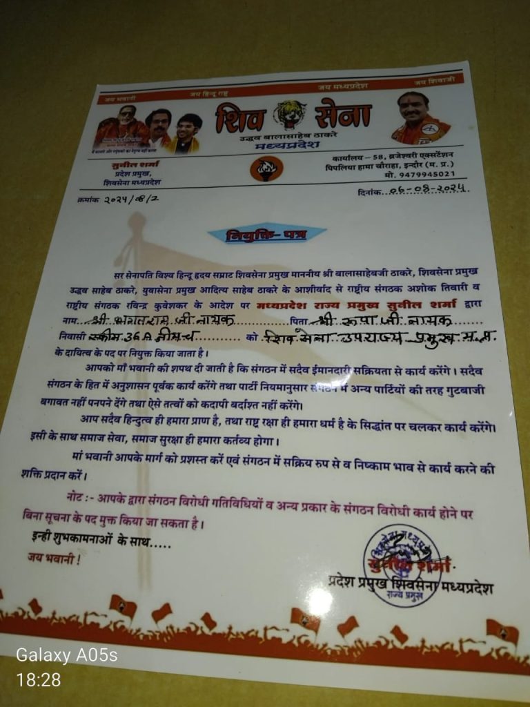 शिव सेना उद्धव बालासाहेब ठाकरे मध्य प्रदेश के उप राज्य प्रमुख के पद पर नियुक्त किया गया….