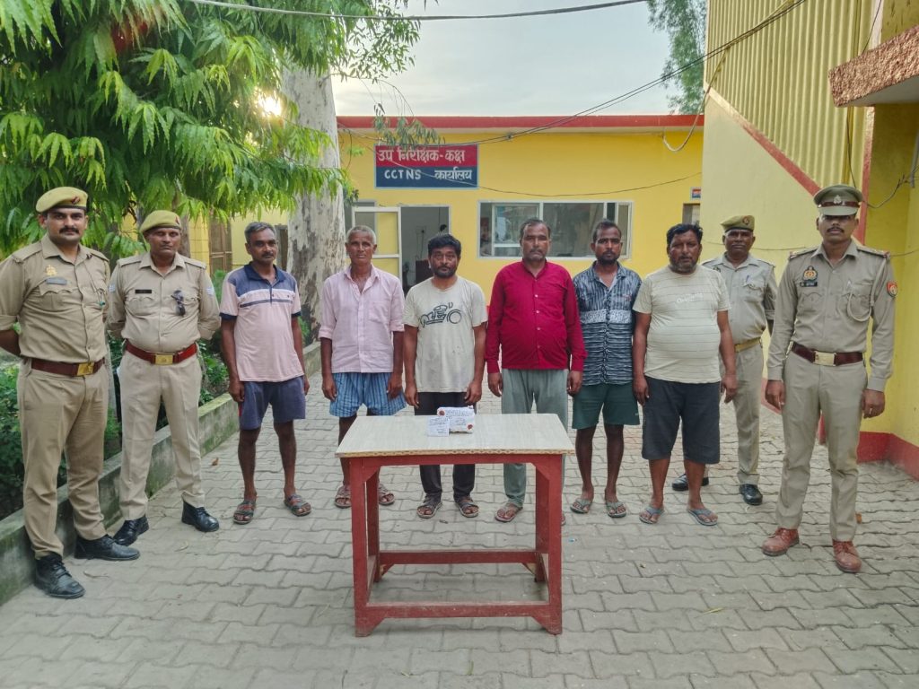 श्री अशोक कुमार मीणा पुलिस अधीक्षक महोदय जनपद शाहजहाँपुर द्वारा अपराध एवं अपराधियों के विरुद्ध चलाये जा रहे अभियान के क्रम में श्री मनोज कुमार अवस्थी पुलिस अधीक्षक ग्रामीण महोदय के निर्देशन व श्री अजय कुमार राय क्षेत्राधिकारी जलालाबाद महोदय के पर्यवेक्षण में एवं प्रभारी निरीक्षक श्री प्रभाष चन्द्र के कुशल नेतृत्व में थाना कलान पुलिस द्वारा दिनांक 13.08.2024 को अभियुक्तगण 1.विजय पुत्र रामचन्द उम्र 39 वर्ष 2. अनिल कुमार पुत्र भवरपाल सिह उम्र करीब 44 वर्ष 3. रामनरेश पुत्र जयराम सिह उम्र करीब 55 वर्ष 4. करु पुत्र जगदीश सिह उम्र करीब 24 वर्ष 5. कल्लू पुत्र सूरजपाल उम्र 40 वर्ष 6. रजीत पुत्र श्यामसिह उम्र करीब 47 वर्ष निवासीगण ग्राम मकरन्दपुर थाना कलान जिला शाहजहांपुर को चरकोड बह्द ग्राम मकरन्दपुर से जुआ खेलते हुये समय करीब 14.05 बजे गिरफ्तार किया गया । जिनकी अभियुक्तवार जामा तलाशी व माल फड से कुल 960 रूपये तथा 52 ताश के पत्तो की 2 गड्डी बरामद हुई । बरामदगी के आधार पर अभियुक्तगण के विरुद्ध अभियोग पंजीकृत कर विधिक कार्यवाही की जा रही है ।